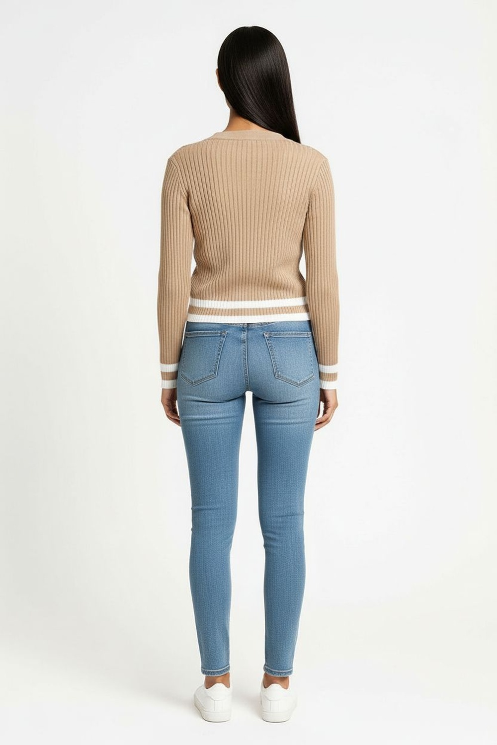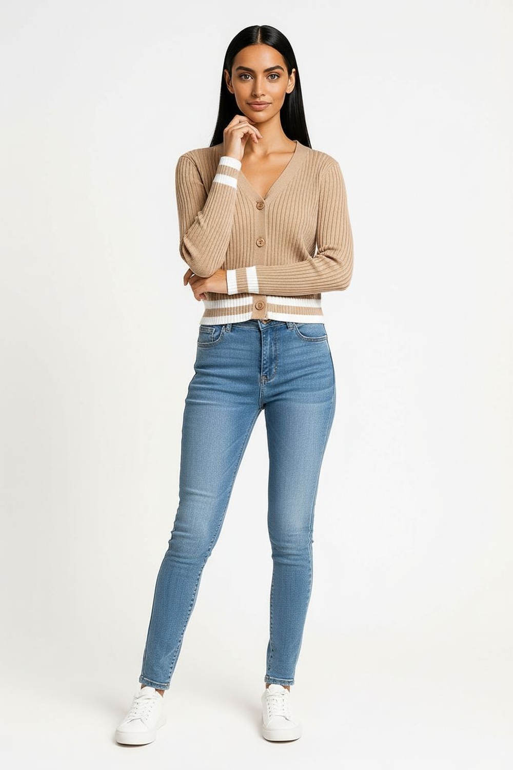 Suéter de manga larga elaborado en tejido ligero con textura acanalada, escote en V con botones frontales que permiten un ajuste personalizado, diseño corto con franjas decorativas en puños y bajo que realzan la confección, tejido flexible que brinda suavidad y comodidad en cada uso