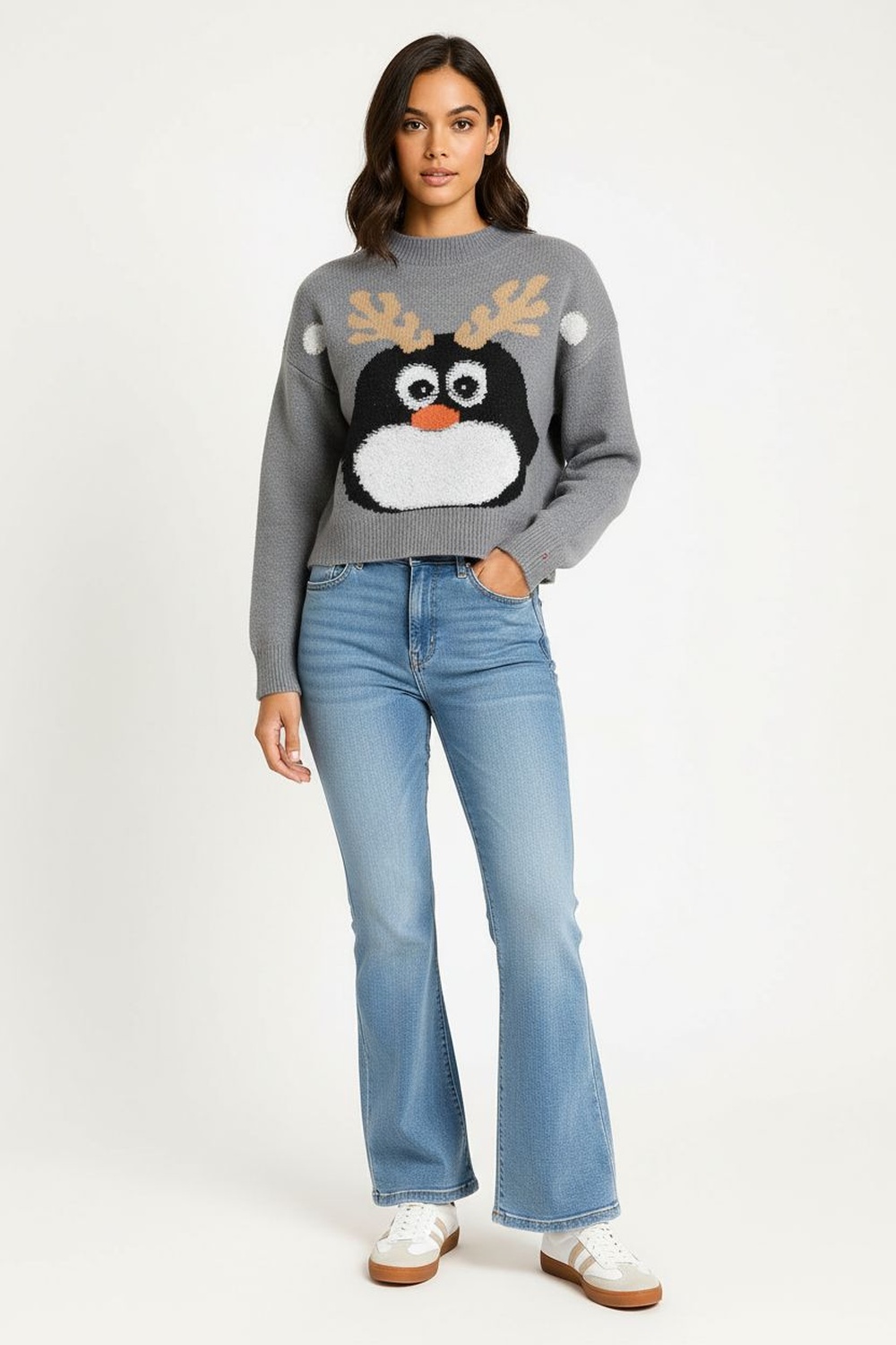 Suéter de tejido suave con aplicación frontal en relieve, cuello redondo y puños acanalados que aseguran ajuste cómodo, diseño divertido con textura cálida perfecta para temporada invernal, estructura ligera que mantiene confort y durabilidad