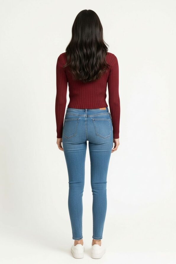Suéter corto de manga larga con tejido acanalado que aporta textura y calidez, escote redondo amplio que realza el cuello, diseño ajustado al cuerpo que resalta la silueta, terminaciones en rib que ofrecen estructura y durabilidad, confeccionado en hilo suave de viscosa que brinda comodidad y un tacto agradable