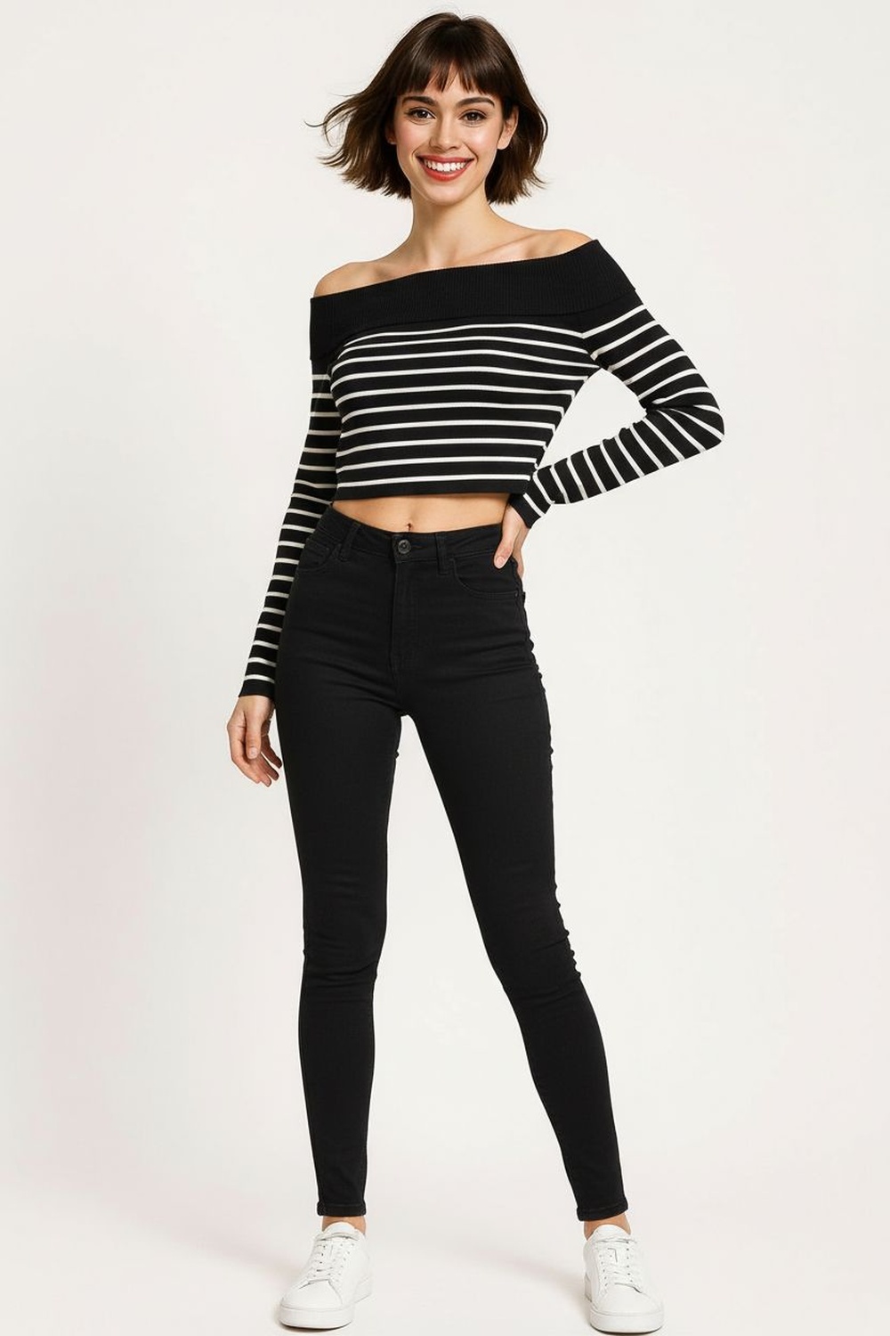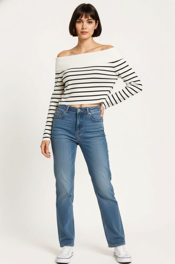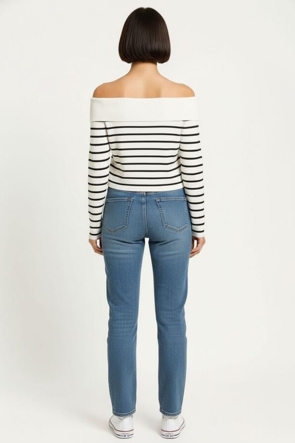 Suéter corto confeccionado en tejido acanalado con diseño moderno que se ajusta cómodamente al cuerpo, escote amplio que realza el cuello y aporta equilibrio visual, manga larga ajustada que estiliza los brazos, estructura elástica que brinda libertad de movimiento y conserva la forma tras cada uso, acabado fino en puños y dobladillo que asegura durabilidad y un look contemporáneo