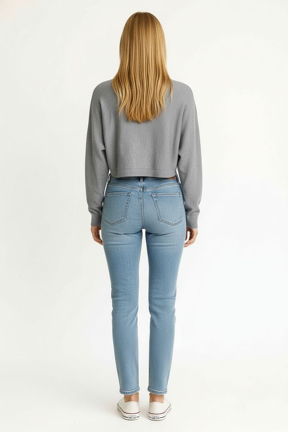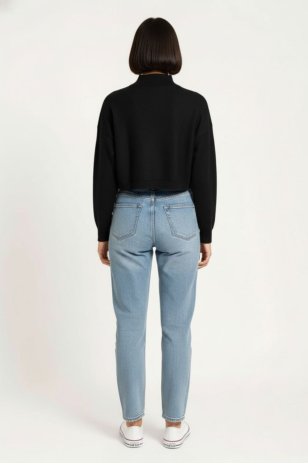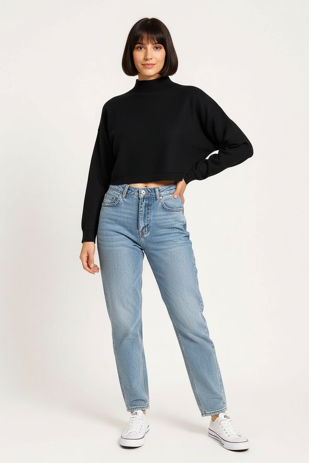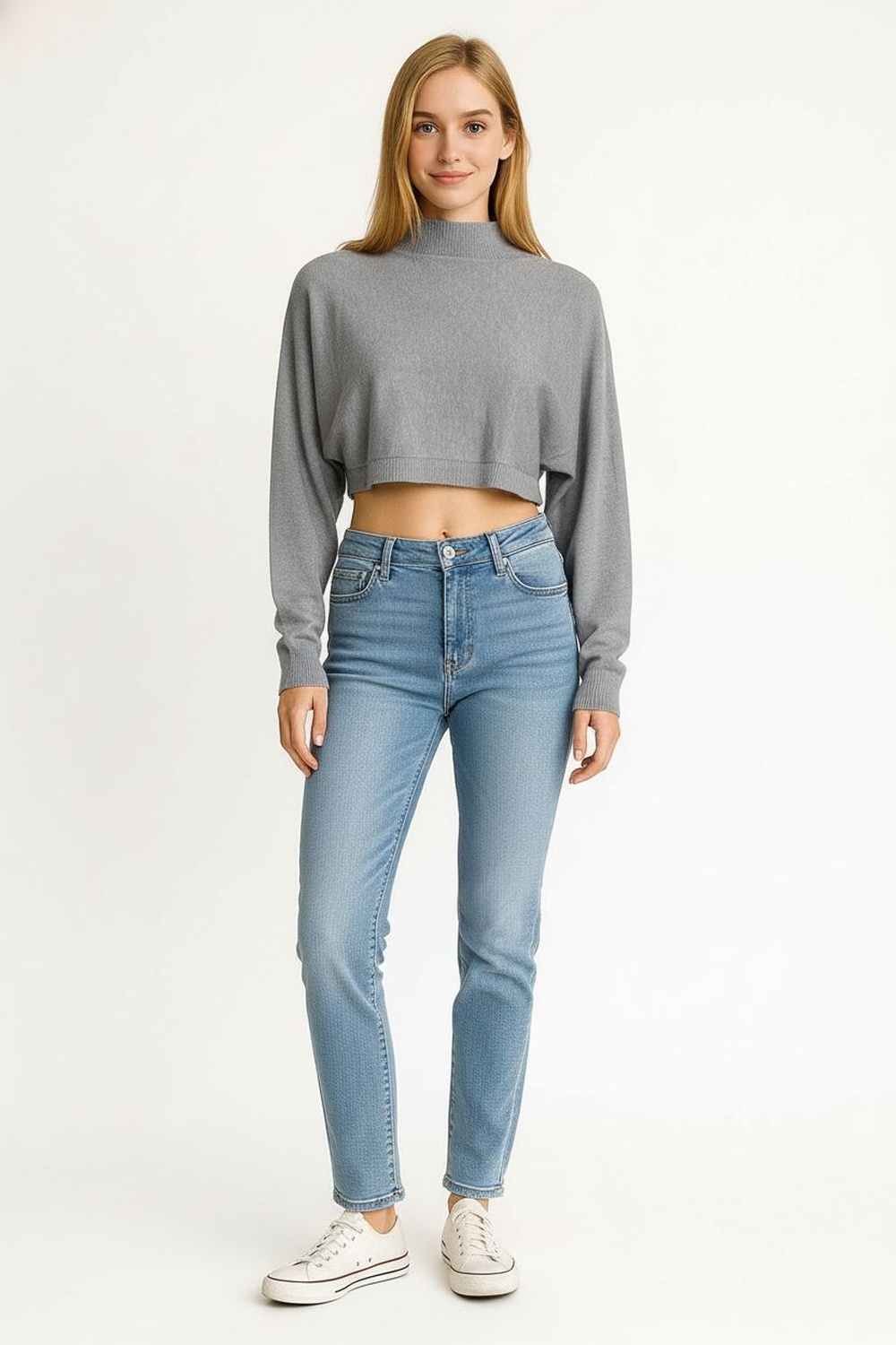 Suéter de punto fino con cuello semi alto, diseño corto con cuerpo suelto y manga vampiro que aporta movimiento, terminaciones en canalé que mantienen la forma y brindan un acabado pulido, confección en tejido suave y ligero