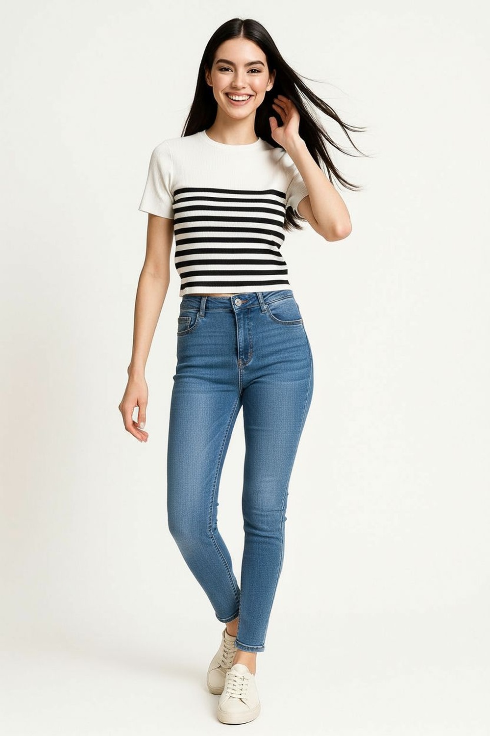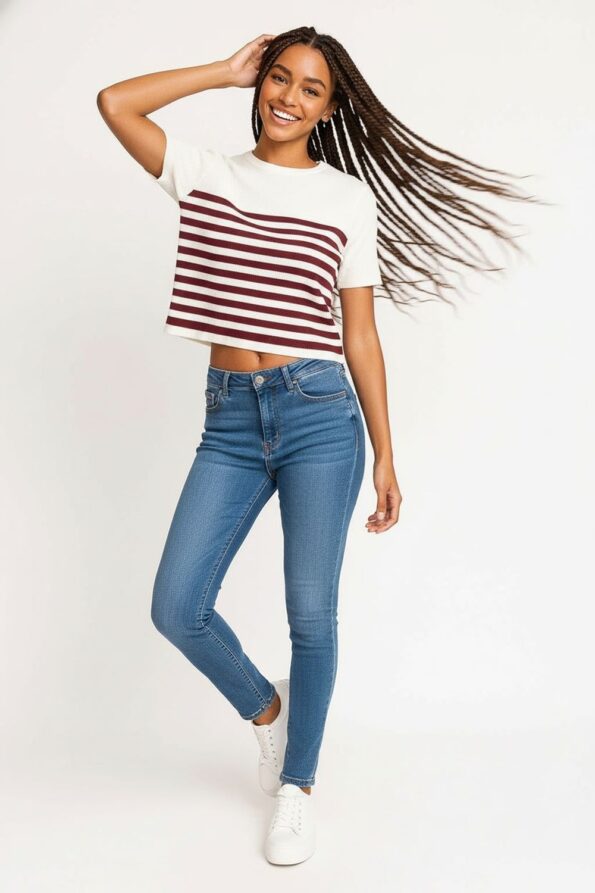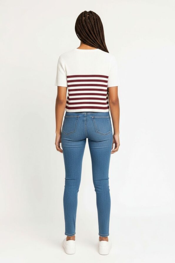 Suéter corto de manga corta confeccionado en tejido de viscosa acanalado que se ajusta suavemente al cuerpo, cuello redondo con acabado limpio que aporta equilibrio al diseño, textura elástica que ofrece comodidad y libertad de movimiento, diseño moderno y versátil ideal para looks casuales de temporada
