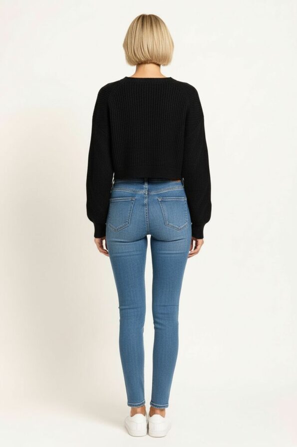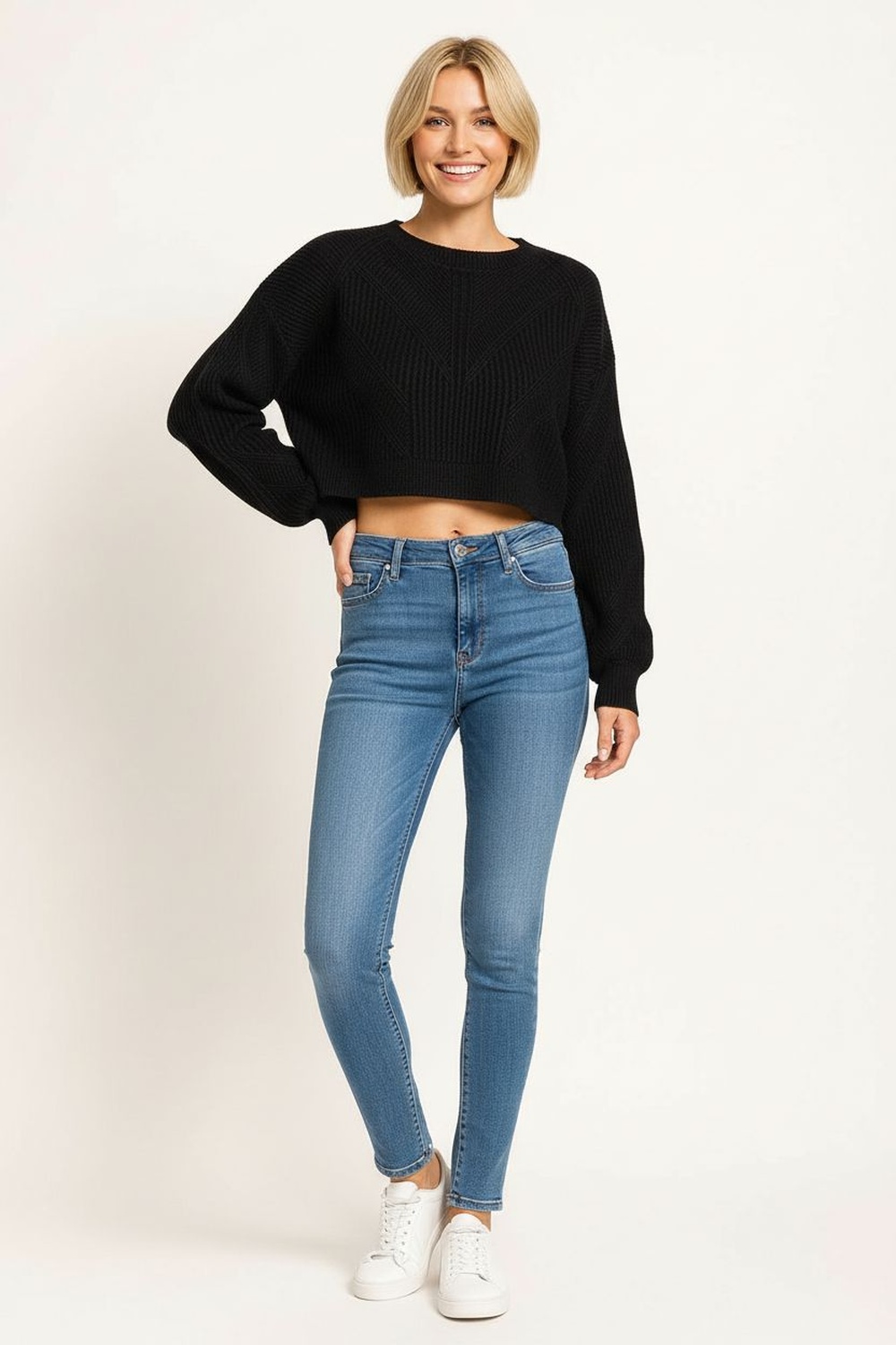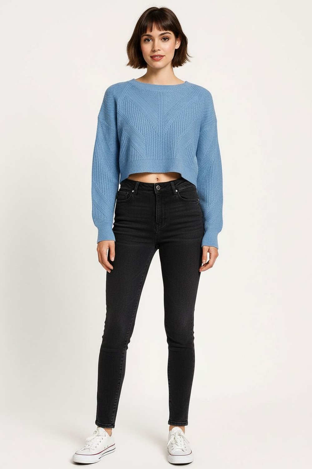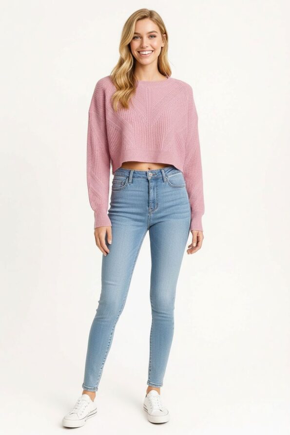 Suéter corto tejido en punto acanalado que ofrece textura moderna y ajuste favorecedor, diseño con manga raglán que aporta mayor comodidad y libertad de movimiento, cuello redondo clásico que realza el acabado versátil de la prenda, dobladillo recto en cintura que mantiene la estructura definida, confección en tejido elástico que asegura confort y durabilidad en cada uso