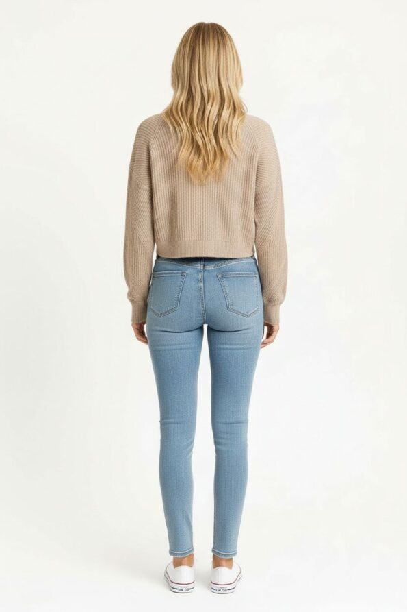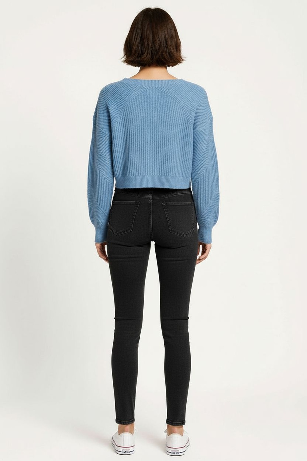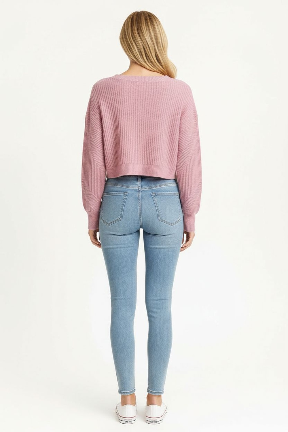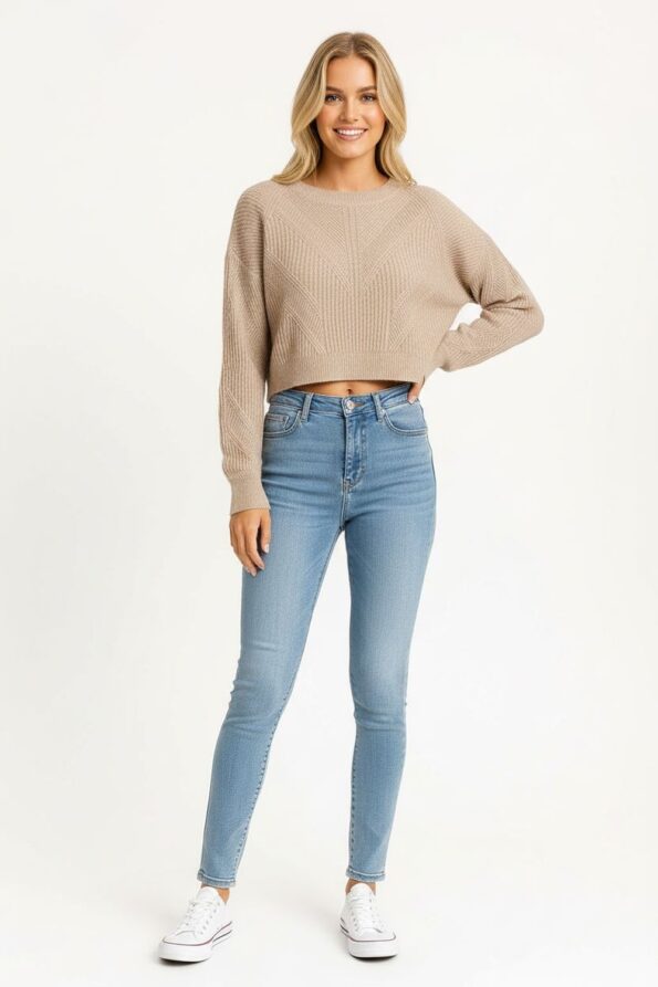Suéter corto tejido en punto acanalado que ofrece textura moderna y ajuste favorecedor, diseño con manga raglán que aporta mayor comodidad y libertad de movimiento, cuello redondo clásico que realza el acabado versátil de la prenda, dobladillo recto en cintura que mantiene la estructura definida, confección en tejido elástico que asegura confort y durabilidad en cada uso