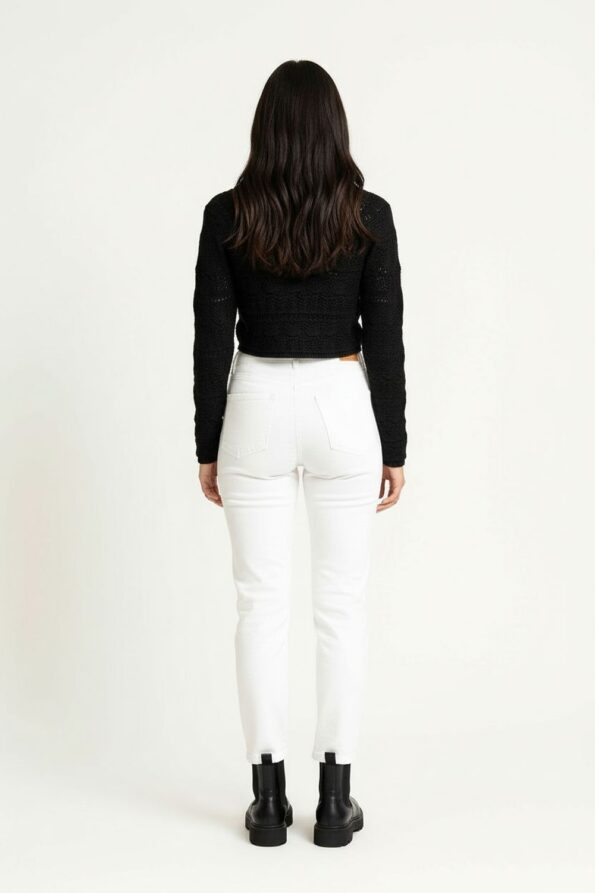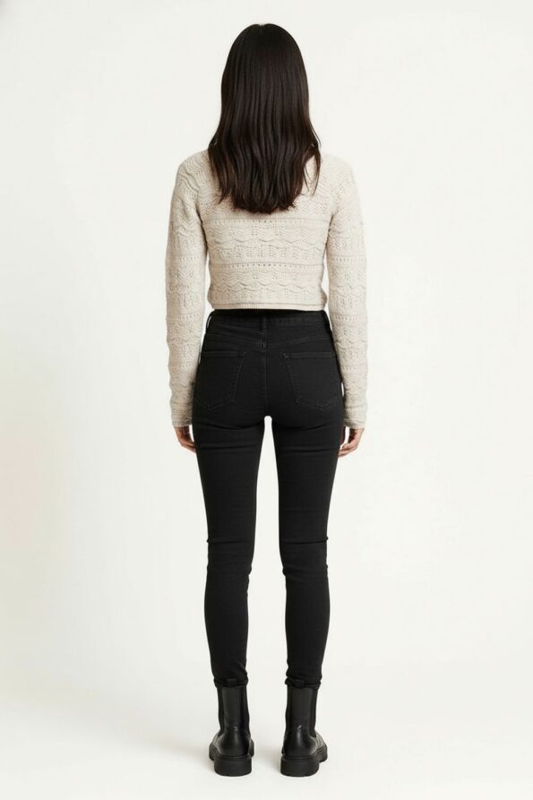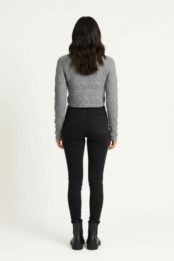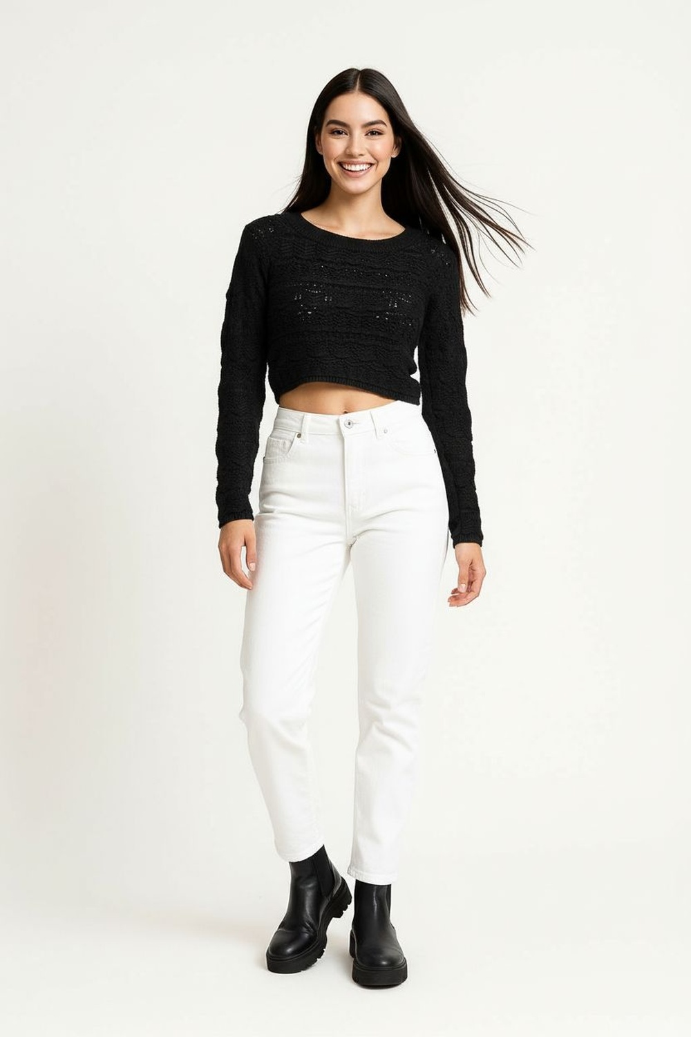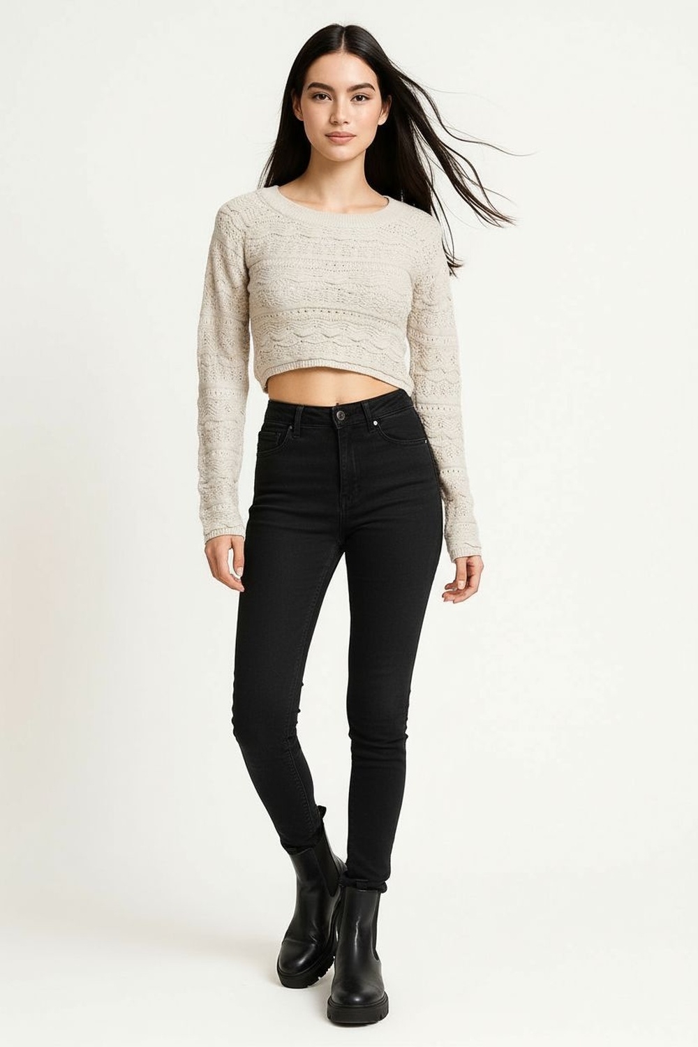 Suéter corto de manga larga con tejido acanalado que aporta textura y calidez, escote redondo amplio que realza el cuello, diseño ajustado al cuerpo que resalta la silueta, terminaciones en rib que ofrecen estructura y durabilidad, confeccionado en hilo suave de viscosa que brinda comodidad y un tacto agradable