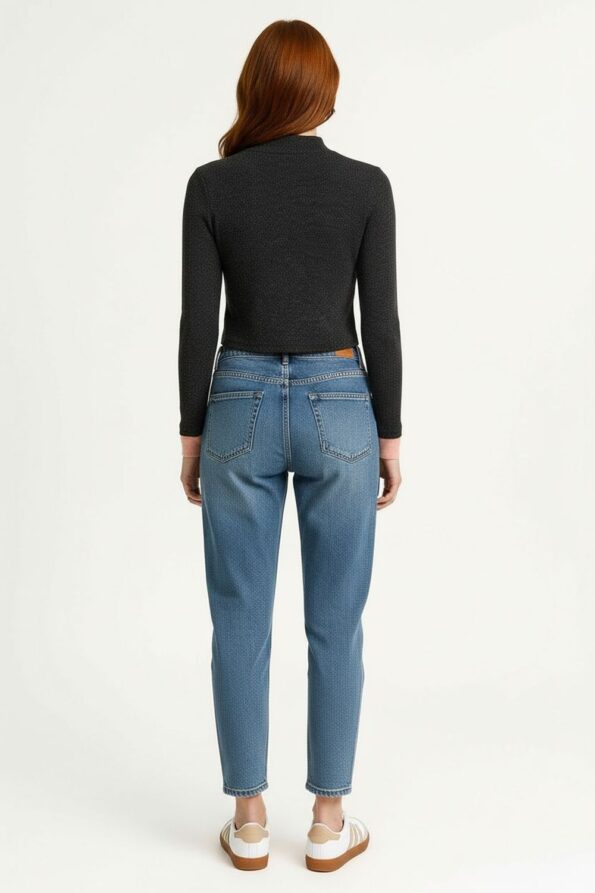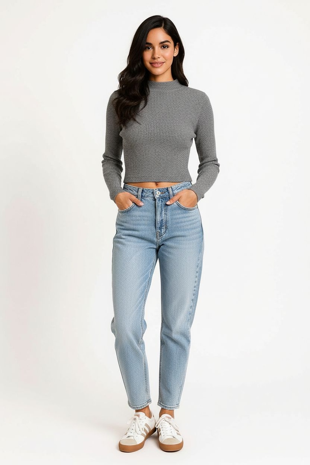 Suéter de manga larga con cuello alto ajustado que brinda estilo y protección, confección en tejido suave con textura ligera, corte crop que realza la silueta con terminación recta, costuras resistentes que aportan mayor durabilidad, prenda versátil para climas frescos