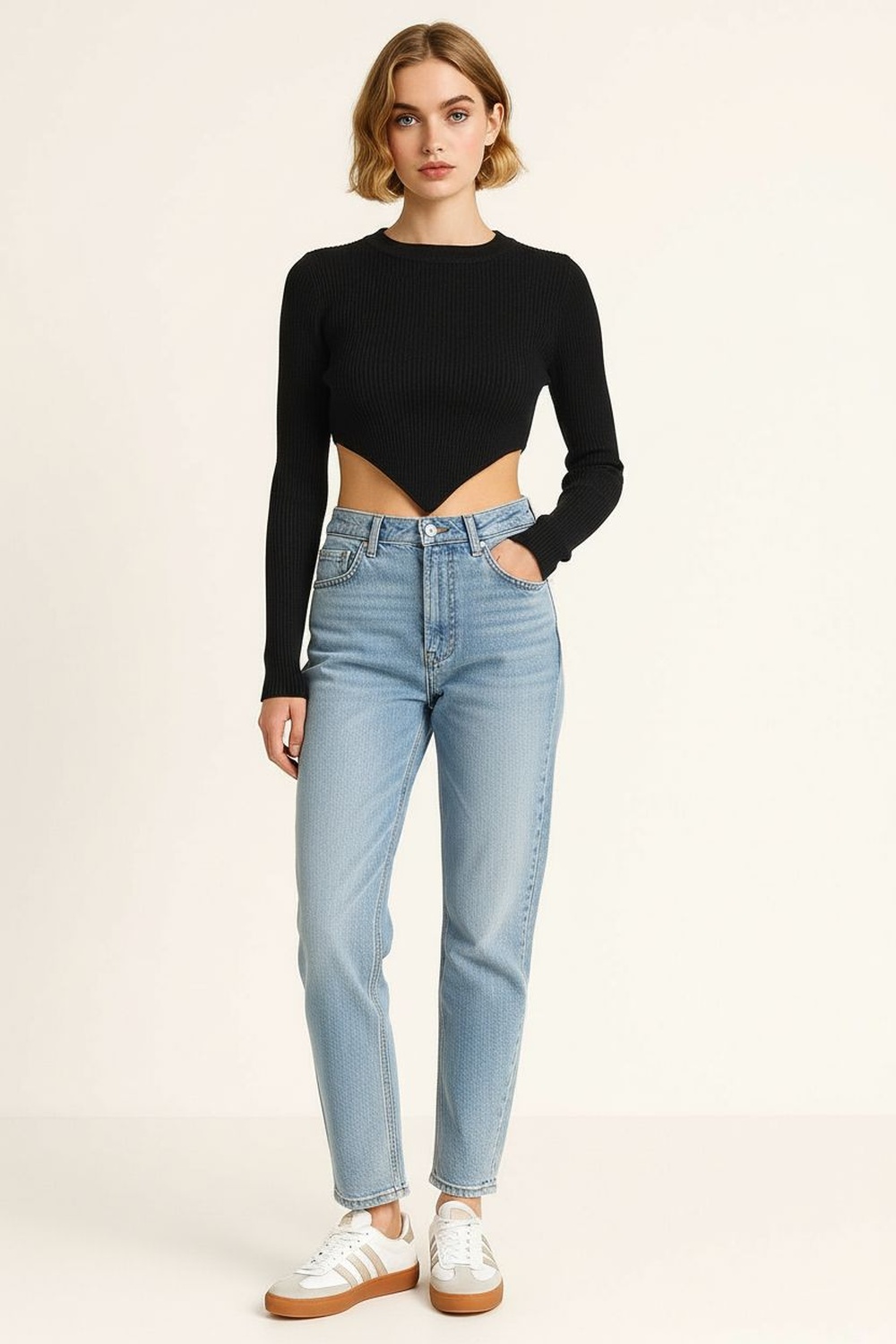 Suéter crop tejido con diseño de punto acanalado que aporta textura y ajuste al cuerpo, escote redondo con terminación limpia que resalta la confección, detalle en corte pico que estiliza la figura y marca la cintura, mangas largas con acabado ceñido que proporcionan comodidad y libertad de movimiento, pretina con refuerzo que mantiene la forma de la prenda