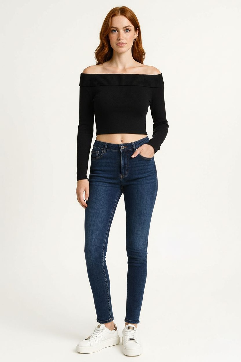 Suéter de manga larga con diseño off shoulder que resalta la silueta femenina, confección en tejido suave y ligero que aporta comodidad, corte cropped que realza la cintura y favorece combinaciones modernas, terminaciones rectas que ofrecen un acabado limpio y versátil para looks casuales o de temporada