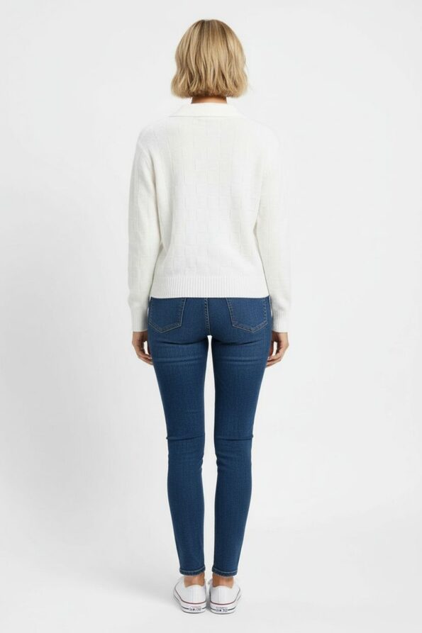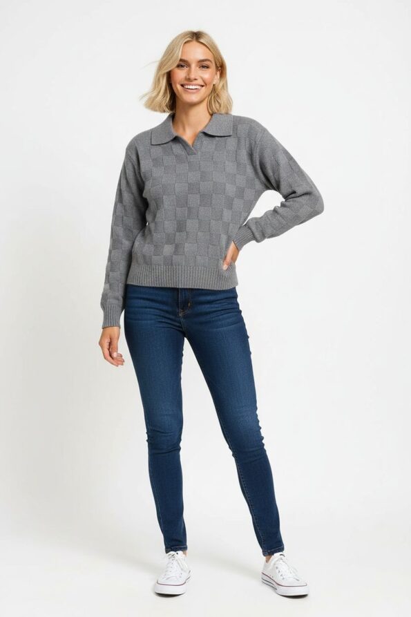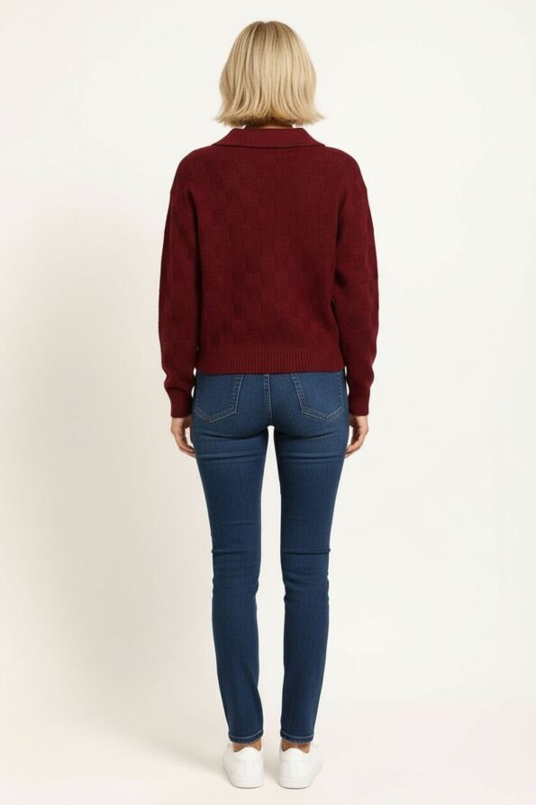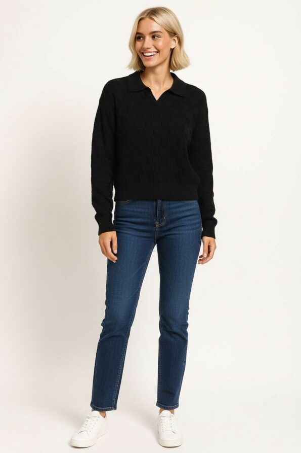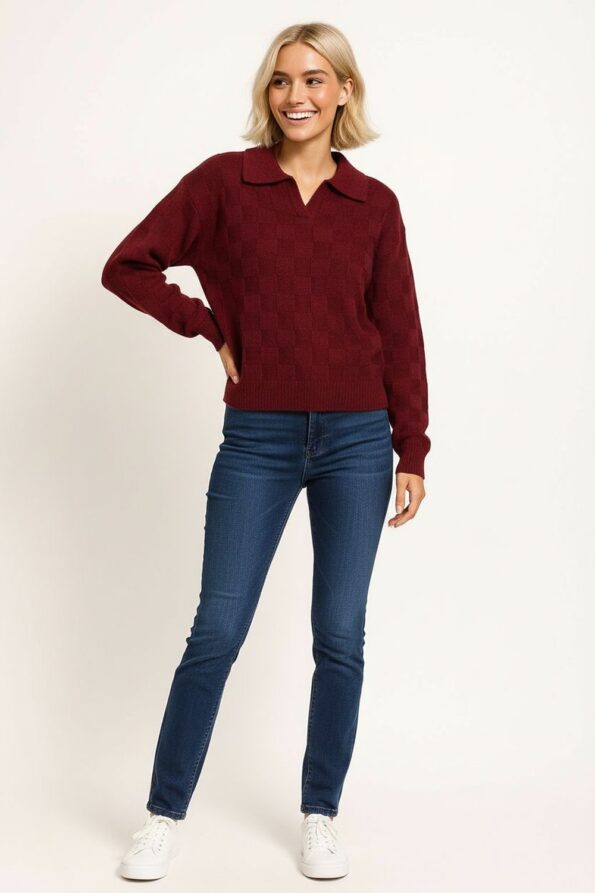 Sueter de manga larga con cuello tipo polo que aporta un estilo moderno y versátil, confección en tejido con relieve de cuadros que brinda textura distintiva y sofisticación, corte recto que favorece la silueta y ofrece comodidad, terminación en pretina y puños acanalados que aseguran mejor ajuste, ideal para outfits casuales y elegantes de temporada