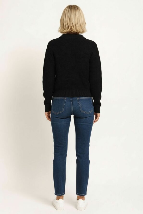 Suéter de manga larga con cuello alto que aporta calidez y estilo, medio cierre frontal que permite un ajuste práctico y versátil, confección en tejido acanalado que se adapta cómodamente al cuerpo, terminado en puños y cintura ajustados que favorecen la silueta, ideal para looks casuales y modernos de temporada