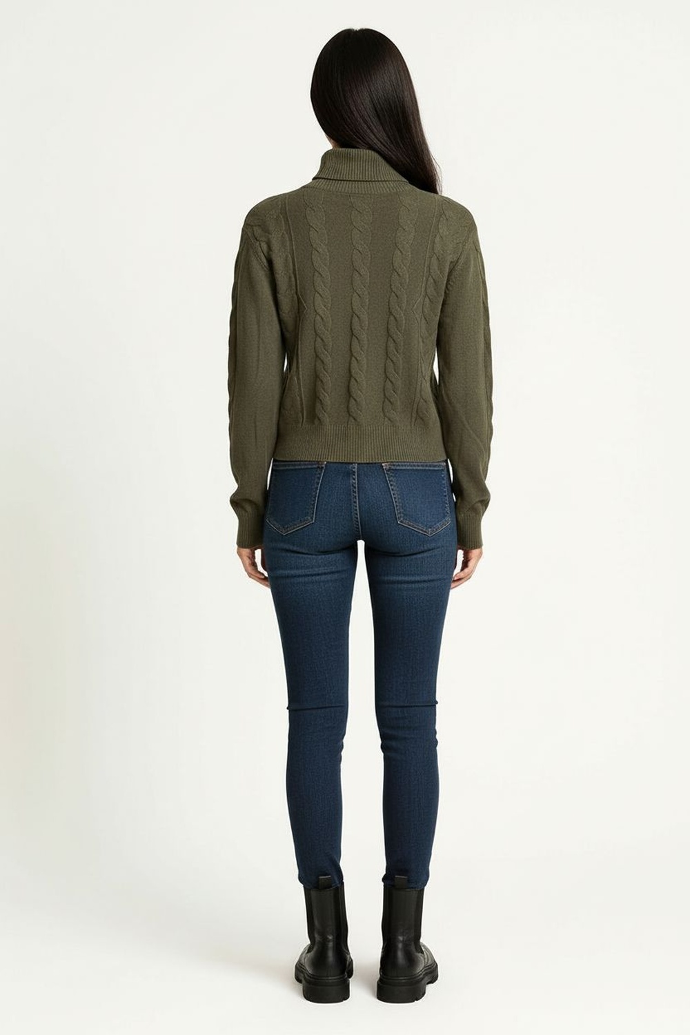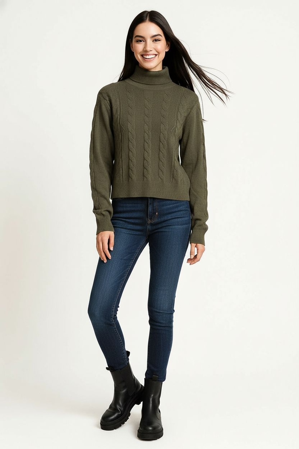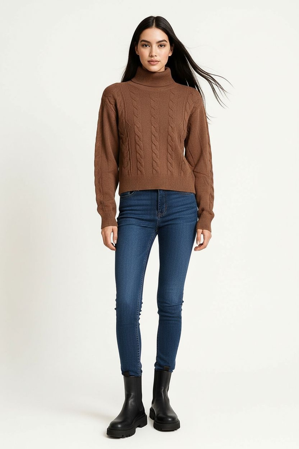 Suéter con cuello ruso de altura media que proporciona cobertura, tejido con relieve lineal que aporta textura, mangas largas con puño ajustado que mantiene forma, contorno inferior ribeteado que asegura soporte, confección en mezcla de viscosa que genera tacto suave y caída controlada