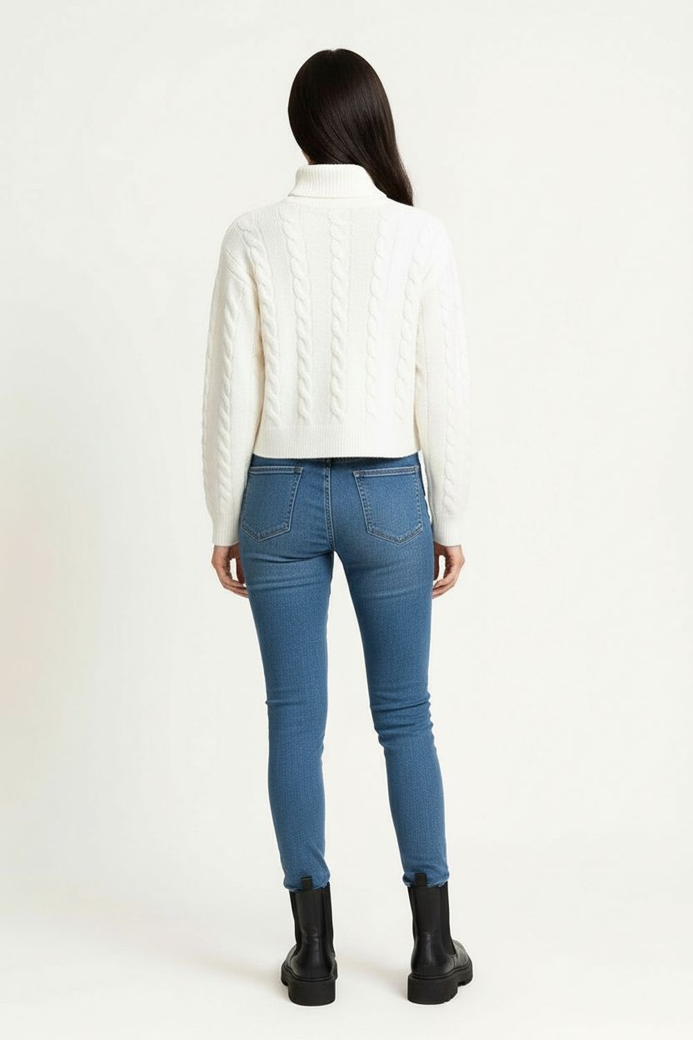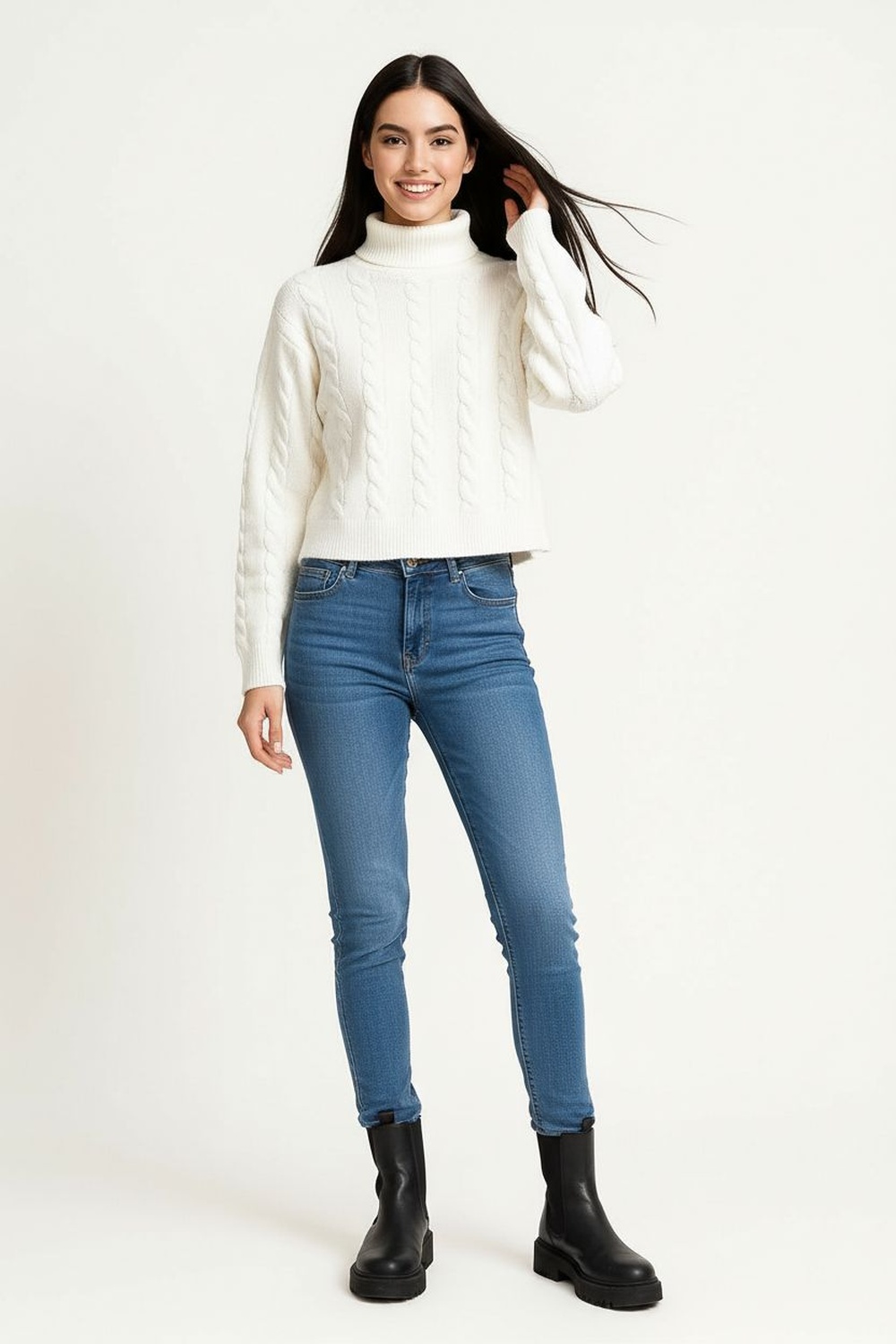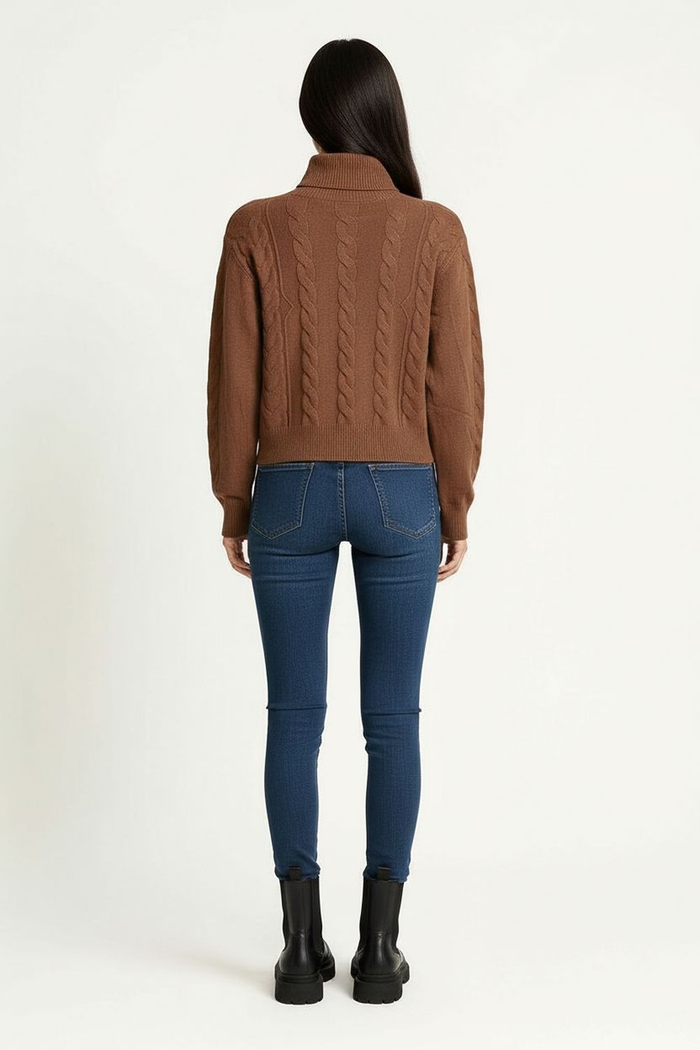Suéter con cuello ruso de altura media que proporciona cobertura, tejido con relieve lineal que aporta textura, mangas largas con puño ajustado que mantiene forma, contorno inferior ribeteado que asegura soporte, confección en mezcla de viscosa que genera tacto suave y caída controlada
