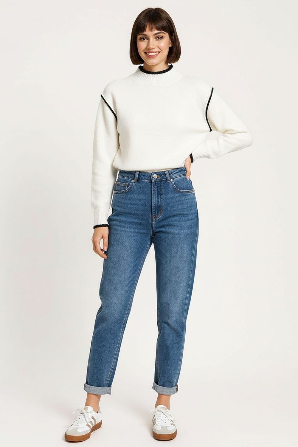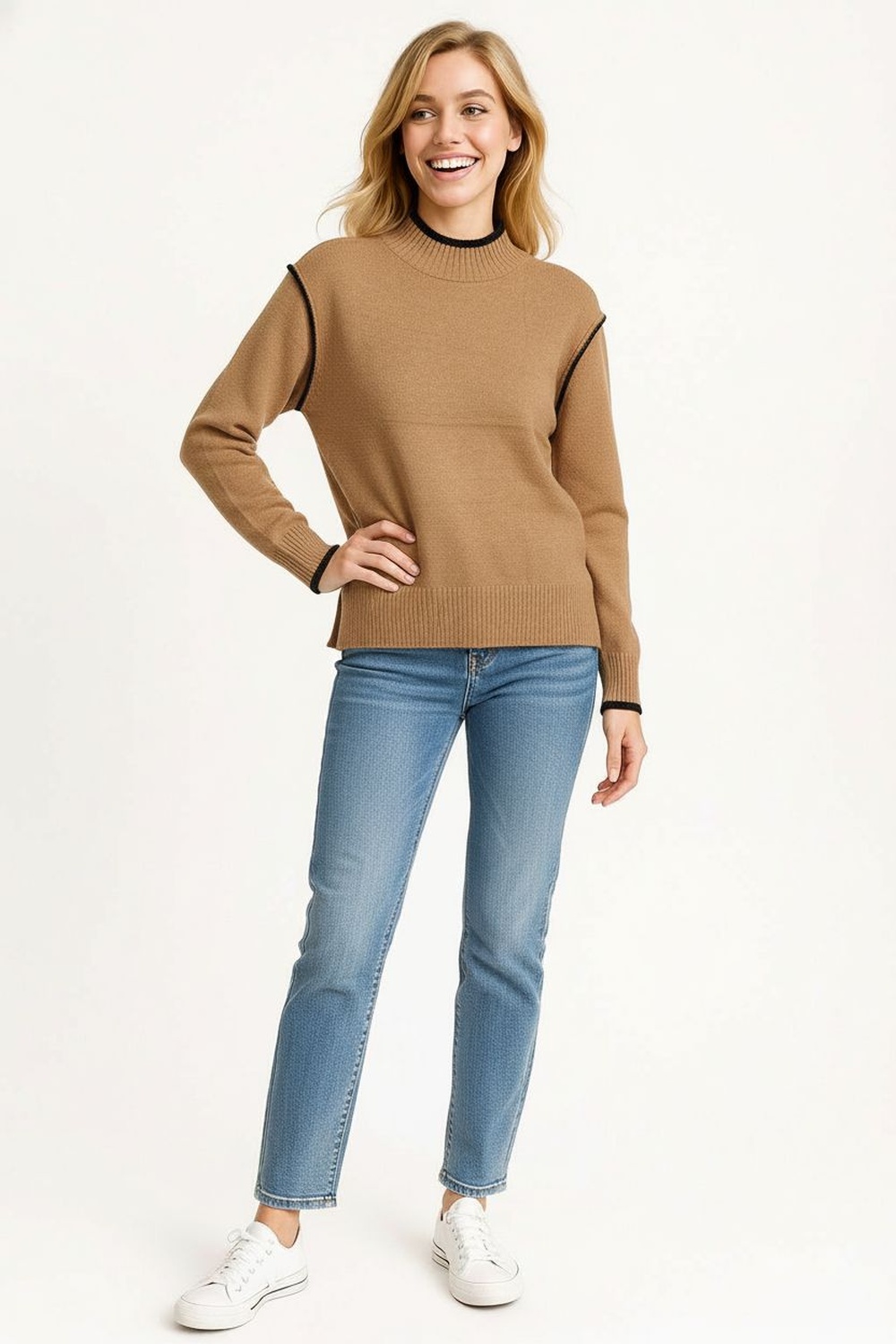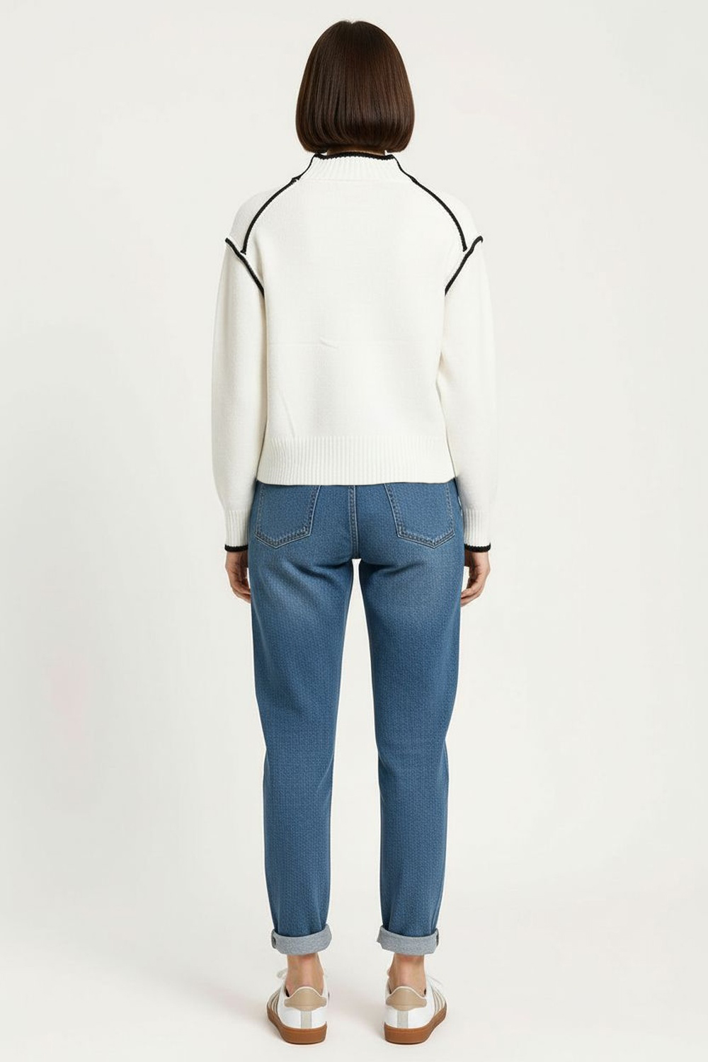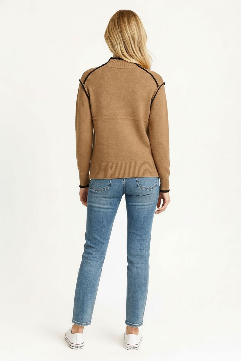 Suéter de punto delgado con cuello alto y detalle en contraste en cuello y puños, estructura ligera que ofrece comodidad y movilidad, acabado acanalado que mantiene la forma, confección de tacto suave y agradable para uso diario
