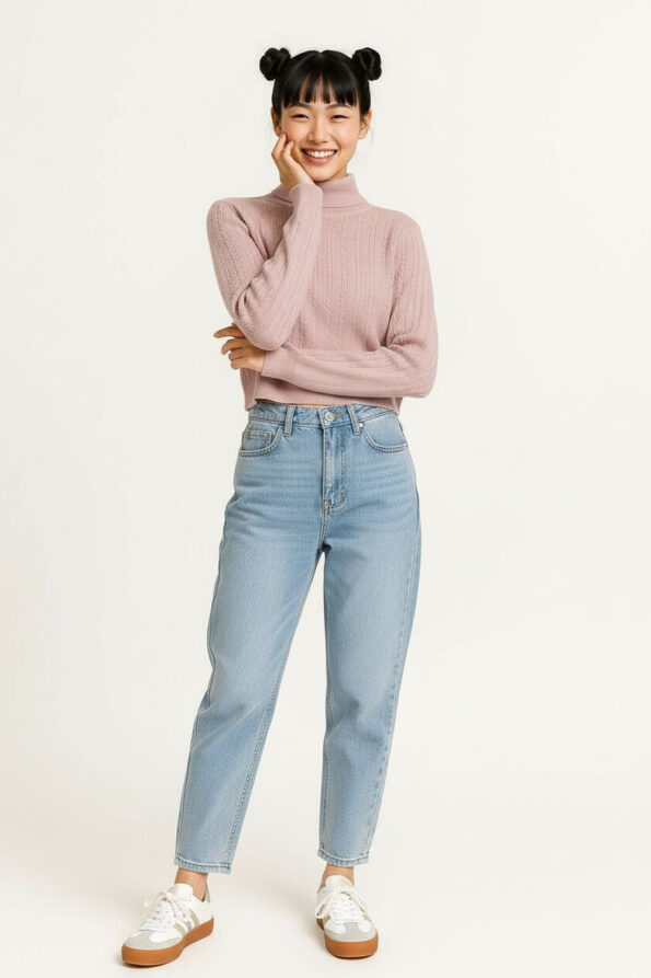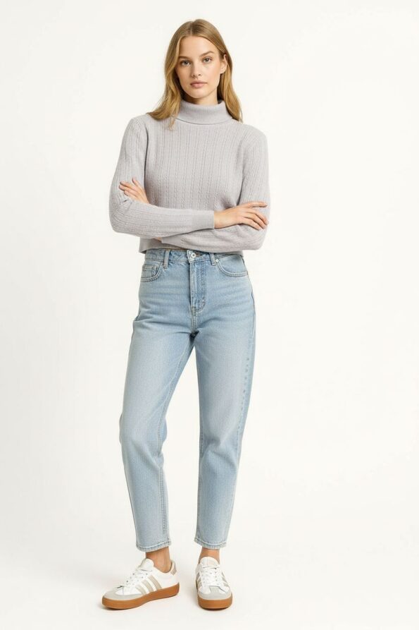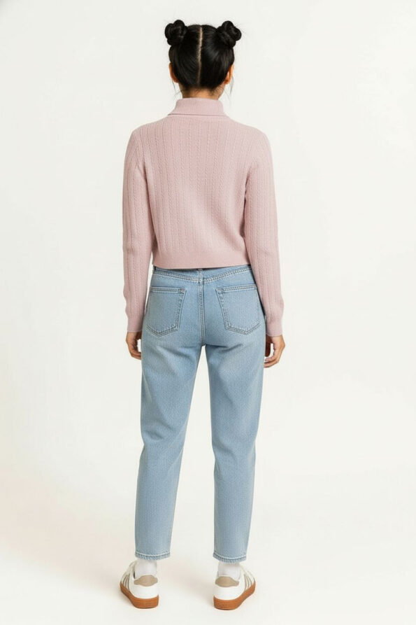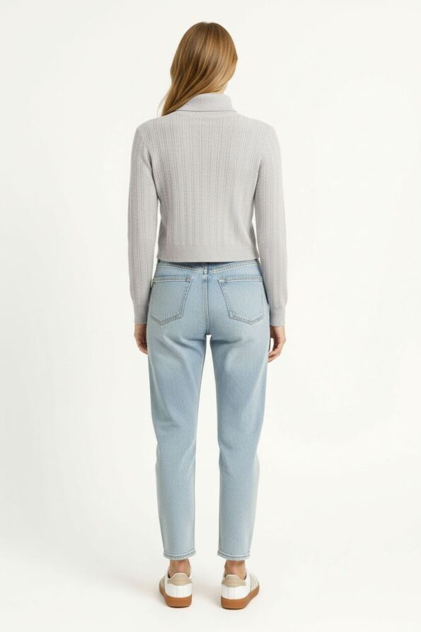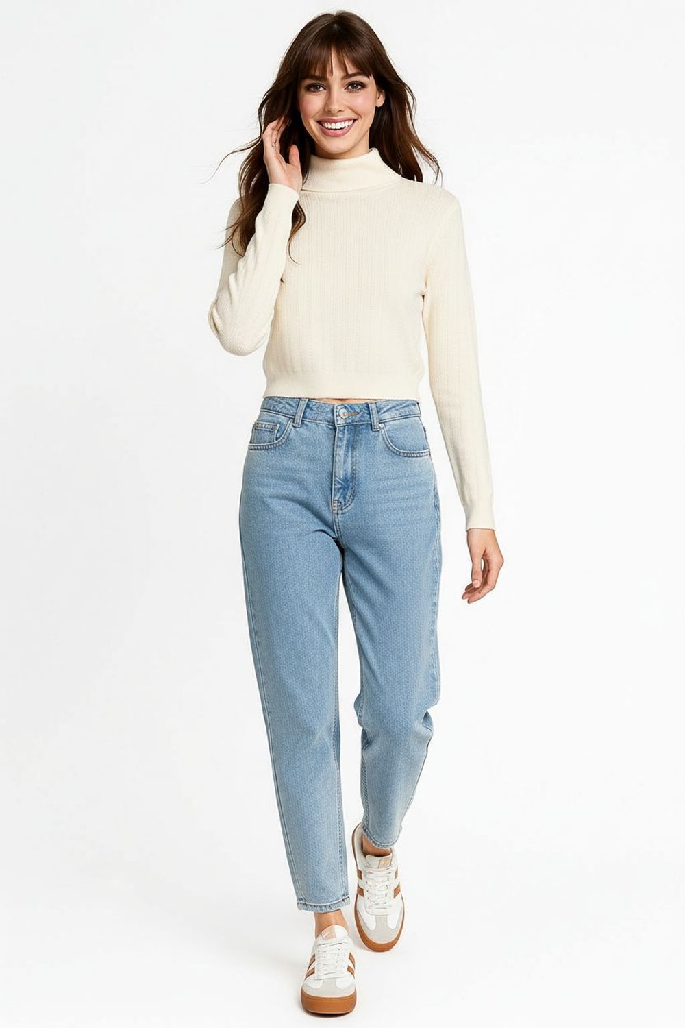 Suéter de manga larga con cuello alto y medio cierre frontal que permite ajustar el escote, tejido acanalado con textura trenzada que aporta un estilo moderno, corte corto que favorece la silueta y proporciona comodidad, confección en tejido suave y elástico que se adapta al cuerpo manteniendo calidez y ligereza