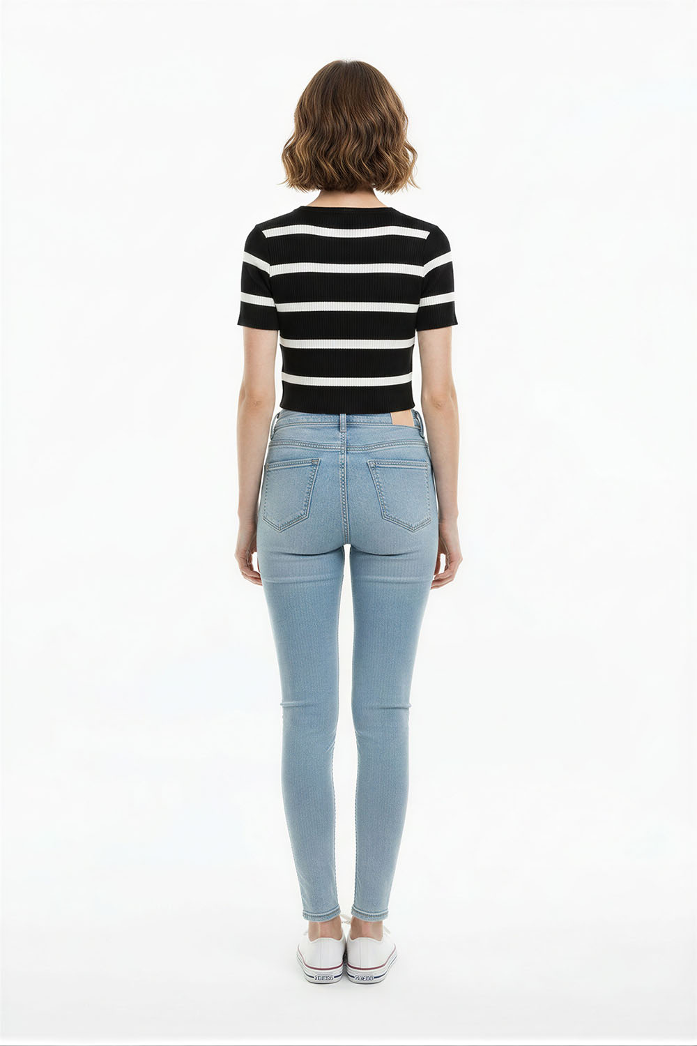Suéter tejido de manga corta con silueta ajustada, cuello redondo reforzado en rib que mantiene la estructura, diseño de líneas horizontales integradas al tejido, jaretas laterales funcionales que permiten ajustar el largo y definir la silueta, terminaciones acanaladas en mangas y bajo que brindan mejor adaptación al cuerpo