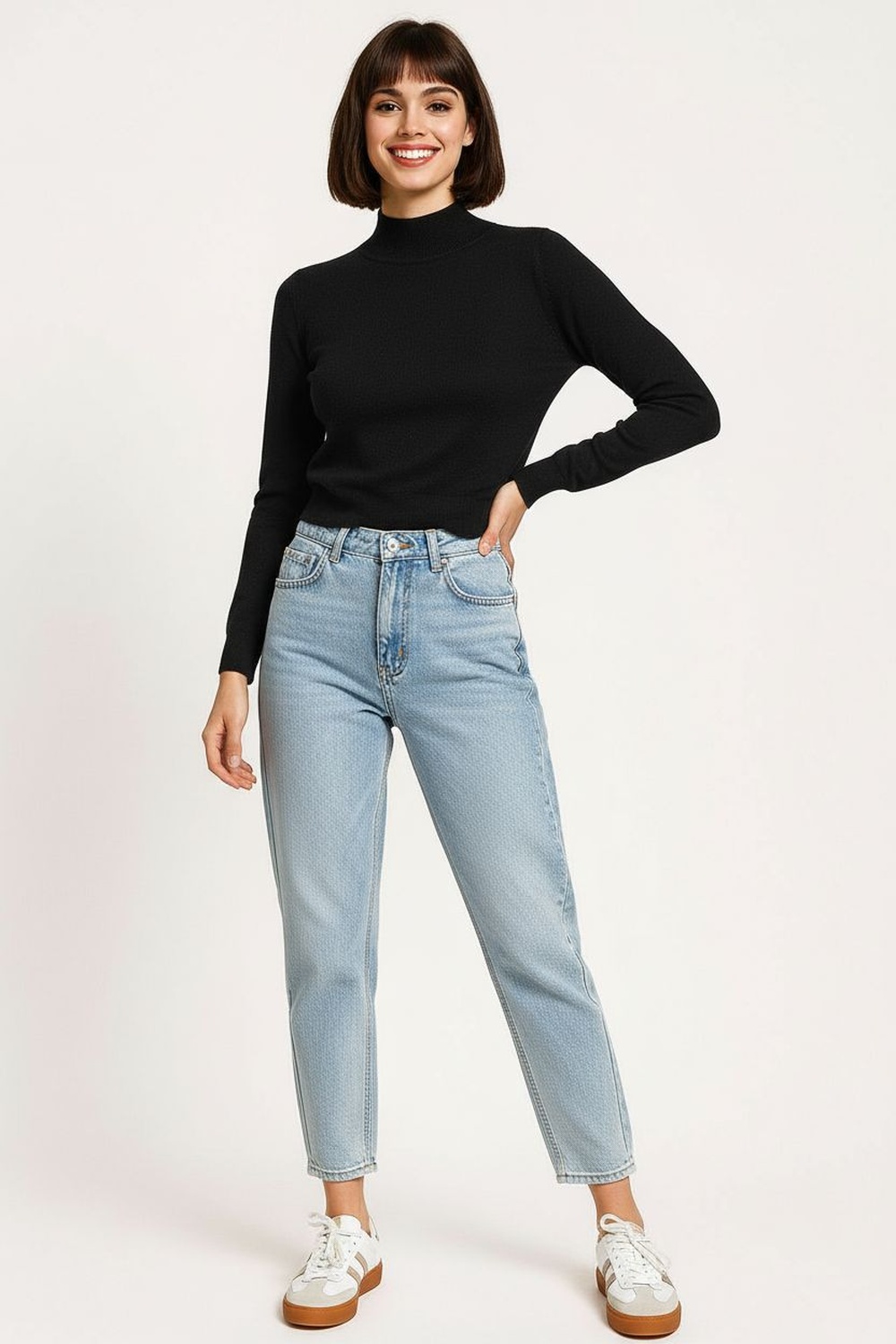 Suéter de manga larga confeccionado en viscosa que aporta suavidad y elasticidad, cuello ruso alto que brinda calidez y estilo elegante, pretina ancha que asegura mejor ajuste y define la silueta, tejido acanalado que ofrece comodidad y ligereza, ideal para looks casuales o combinaciones sofisticadas de temporada