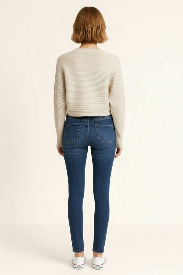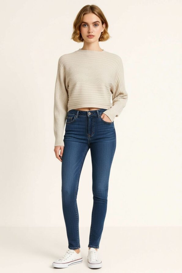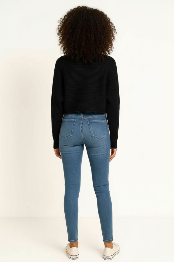 Suéter de manga larga confeccionado en tejido de punto acanalado que aporta textura y elasticidad, cuello alto que brinda un acabado moderno y elegante, diseño ajustado al cuerpo que realza la silueta, largo a la cintura que favorece un estilo actual y versátil, acabado en puños y basta que asegura durabilidad y un mejor ajuste