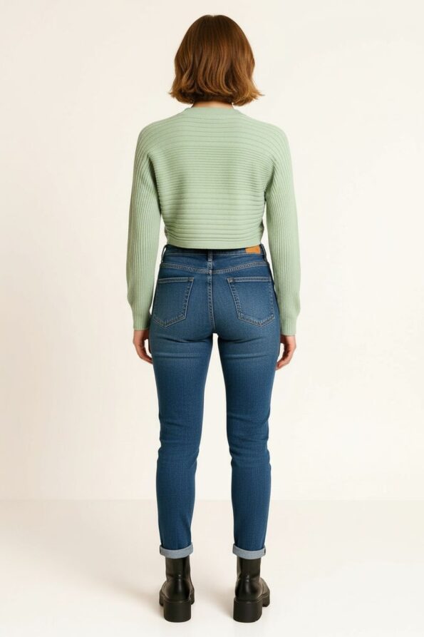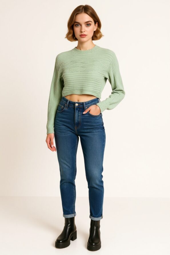Suéter tejido de manga larga con cuello tipo polo que aporta un estilo moderno y elegante, diseño crop que realza la silueta y brinda un toque juvenil, confección en punto de textura suave que asegura comodidad y frescura, ribete en contraste en puños y dobladillo que añade un detalle distintivo, ajuste favorecedor que combina practicidad y versatilidad en cada uso