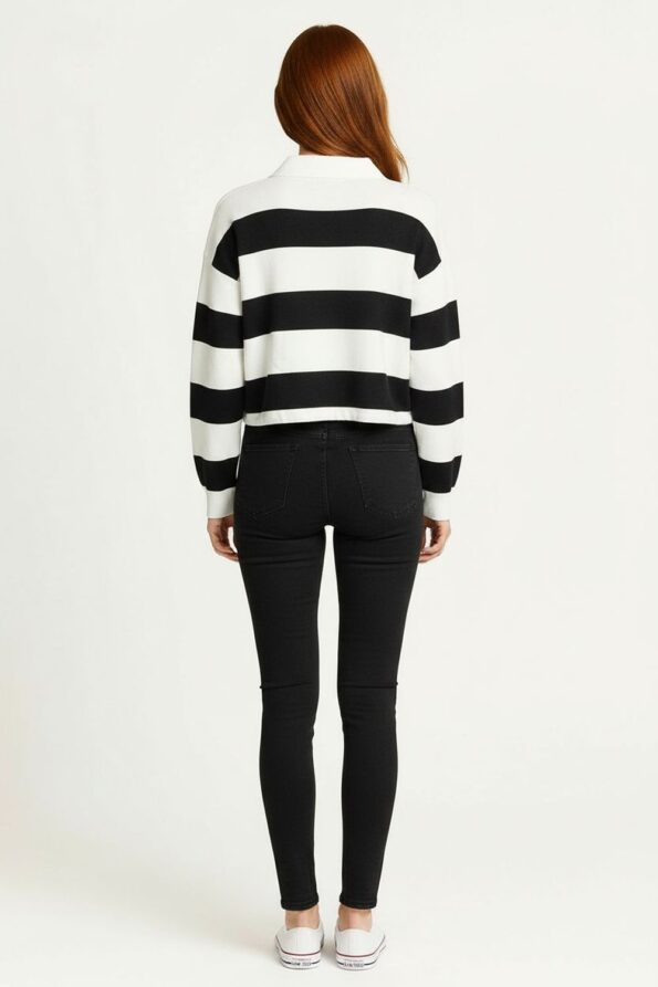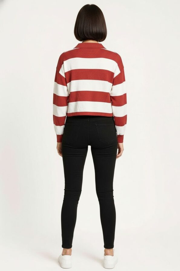 Blusa crop confeccionada en tejido con textura acanalada que brinda elasticidad y confort, cuello camisero con cierre de botones frontales que aporta un toque estructurado y moderno, mangas largas con acabado acampanado que estilizan el brazo y añaden movimiento, confección ligera que se adapta al cuerpo manteniendo un ajuste favorecedor