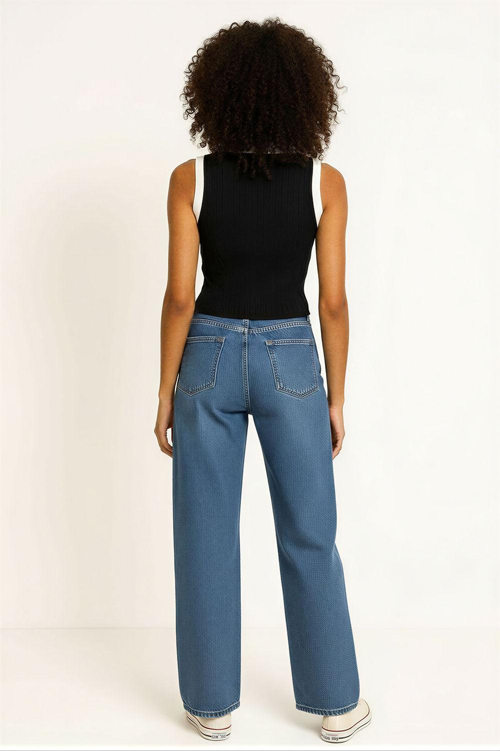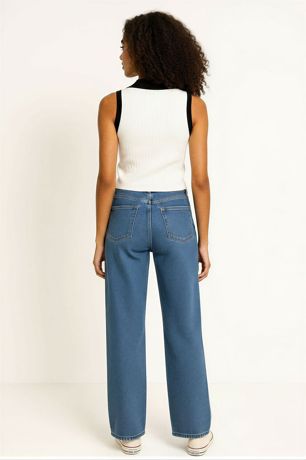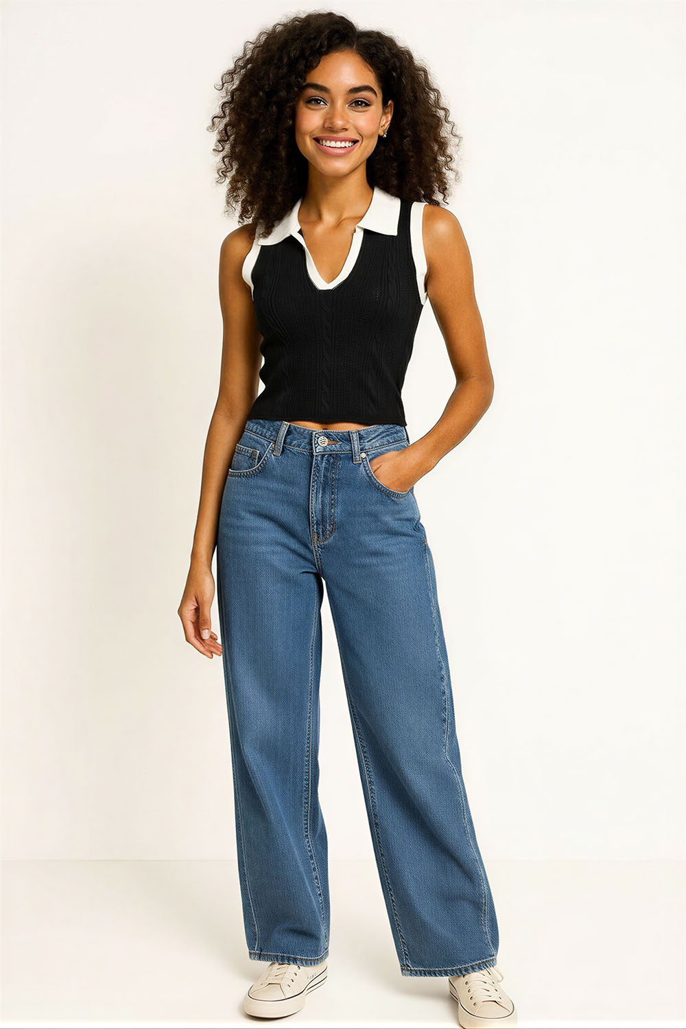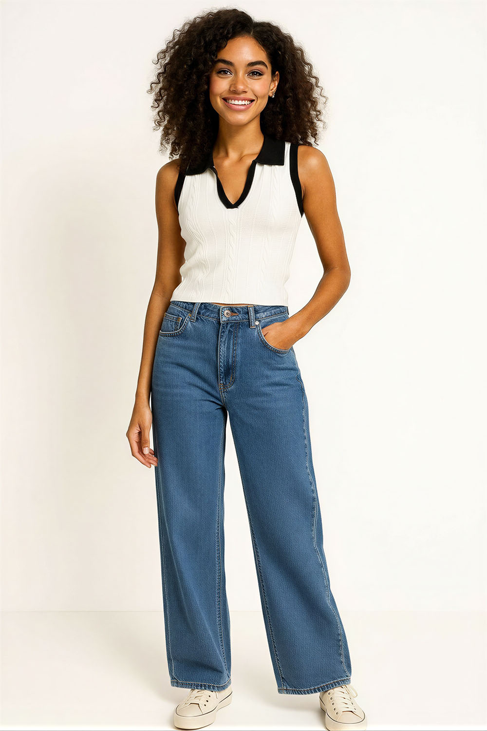 Suéter sin manga con escote en V que estiliza el área superior, cuello tipo polo en contraste que aporta detalle distintivo, confección en tejido ligero con textura que brinda comodidad, corte recto que se adapta al cuerpo, acabado inferior con ajuste suave que mejora la forma