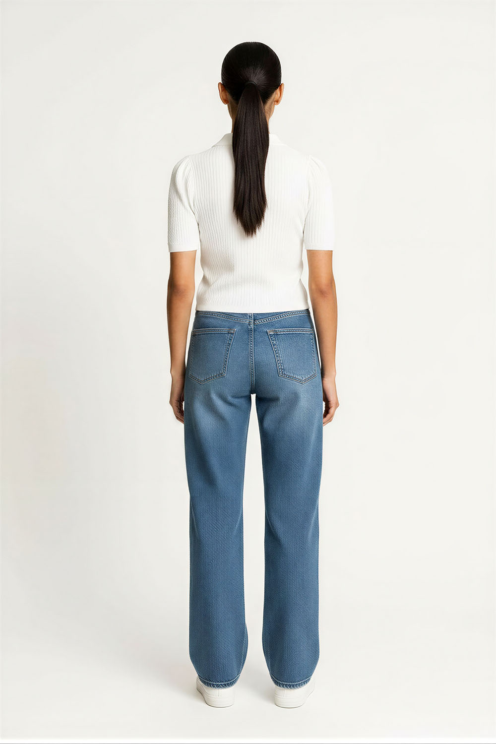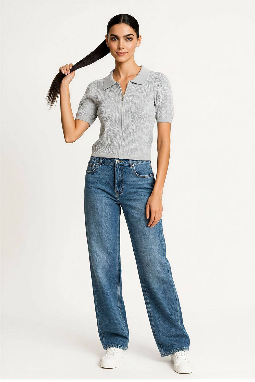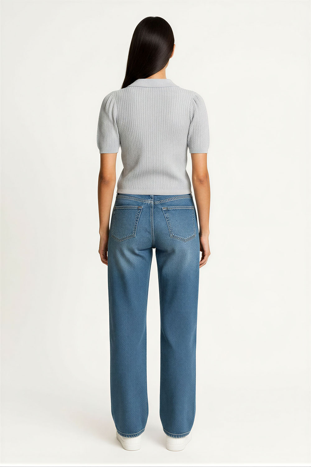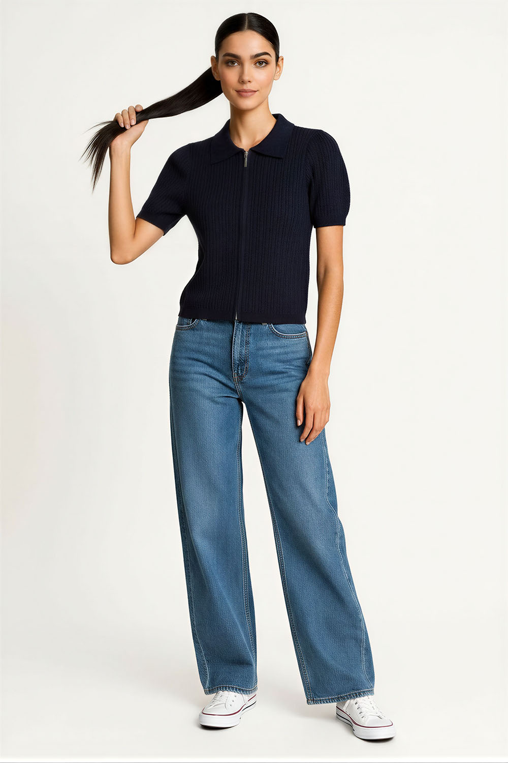 Suéter de manga corta con cuello tipo polo, tejido ligero, ajuste al cuerpo, terminado recto, diseño cómodo