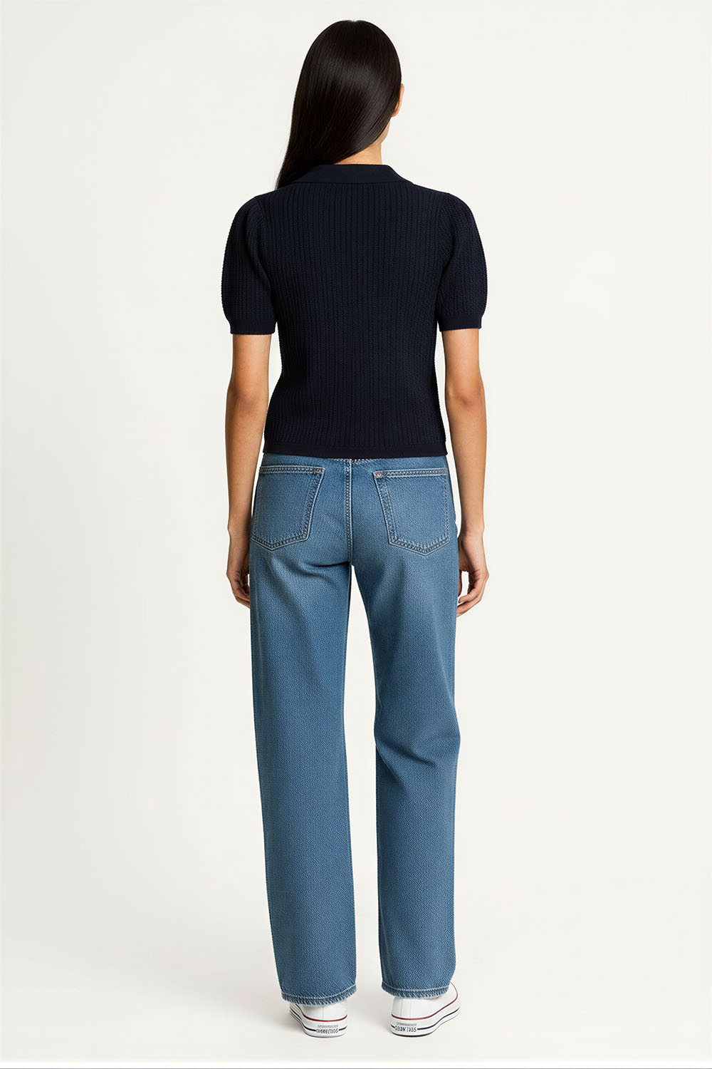 Suéter de manga corta con cuello tipo polo, tejido acanalado, ajuste al cuerpo, terminado recto, diseño ligero