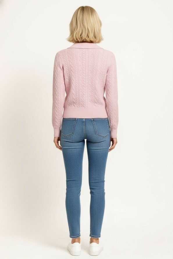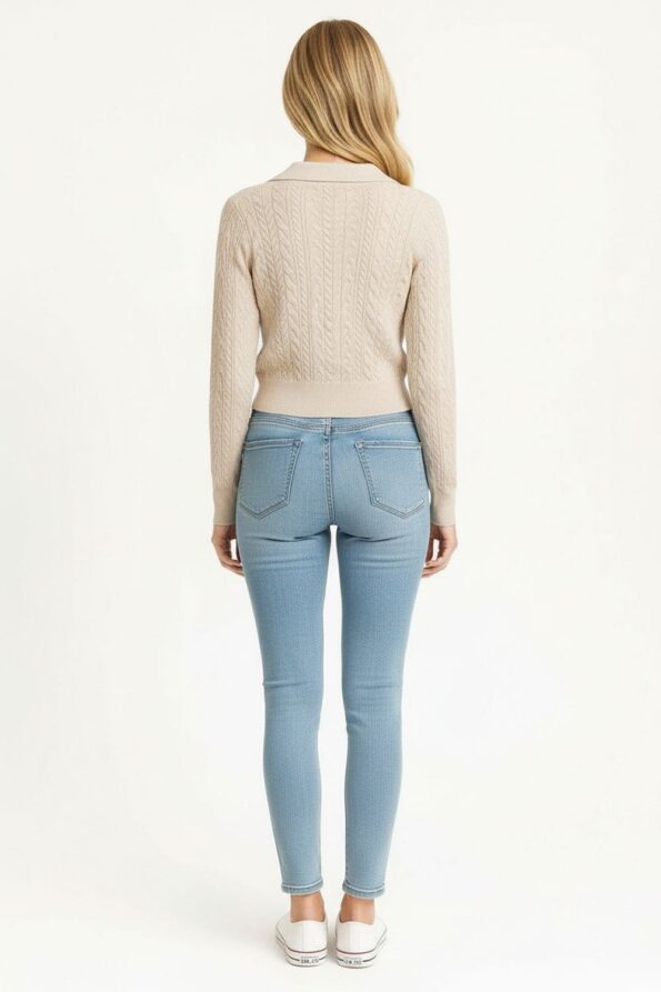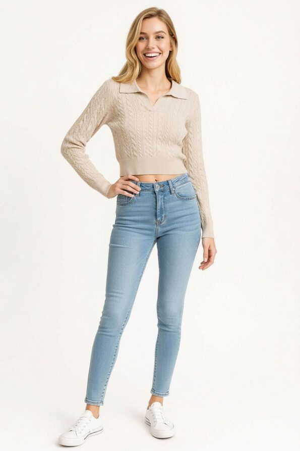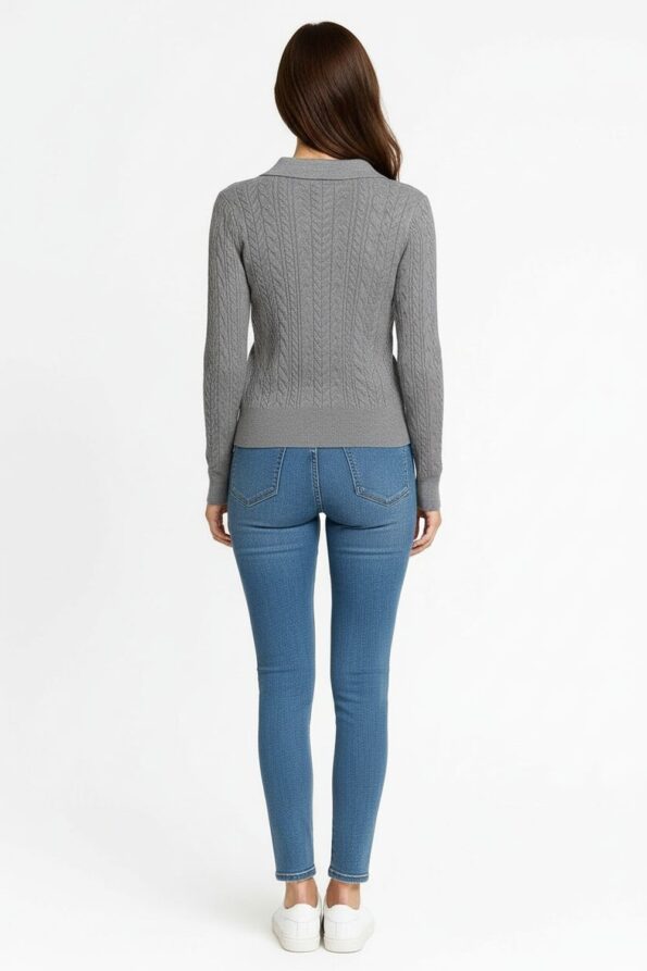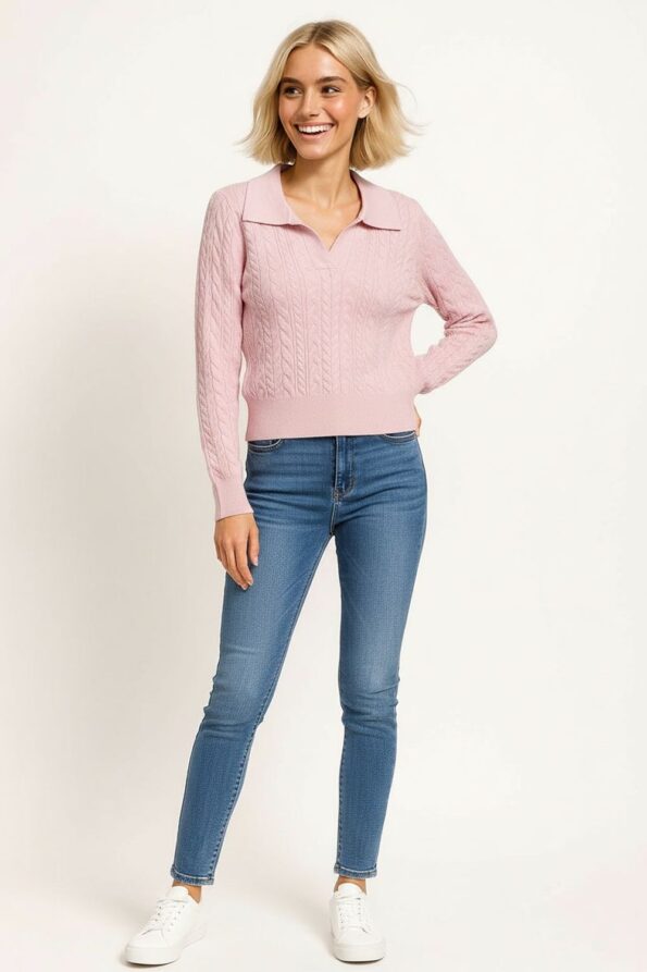 Suéter de manga larga con tejido trenzado que aporta textura y elegancia, cuello tipo polo con escote en V que realza el diseño, pretina y puños acanalados que proporcionan ajuste y estructura, confección en punto elástico de tacto suave que ofrece comodidad y un estilo moderno para combinar con distintos looks