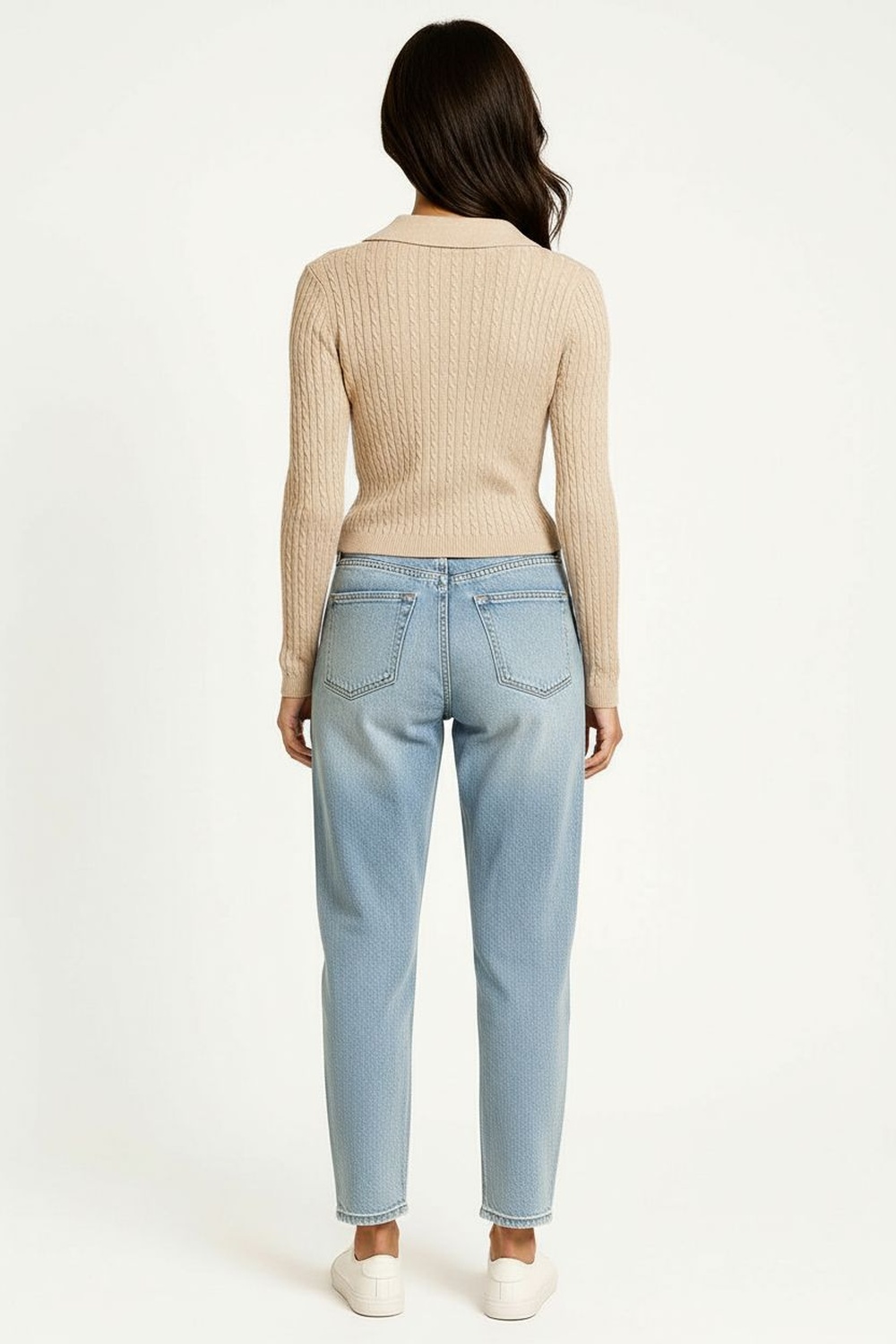 Suéter de punto fino con diseño de grecas tejidas, cuello tipo polo con escote en V que estiliza el cuello, manga larga ajustada y dobladillo a la cadera, tejido elástico que aporta comodidad y libertad de movimiento