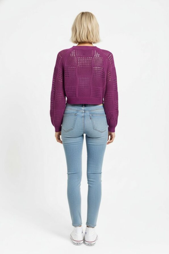 Suéter de tejido calado con diseño geométrico que aporta textura y ligereza, cuello redondo reforzado que mantiene su forma, manga larga con acabado ajustado que proporciona comodidad, pretina ancha que define la silueta, confección en material suave y transpirable que permite libertad de movimiento y un ajuste cómodo durante el uso