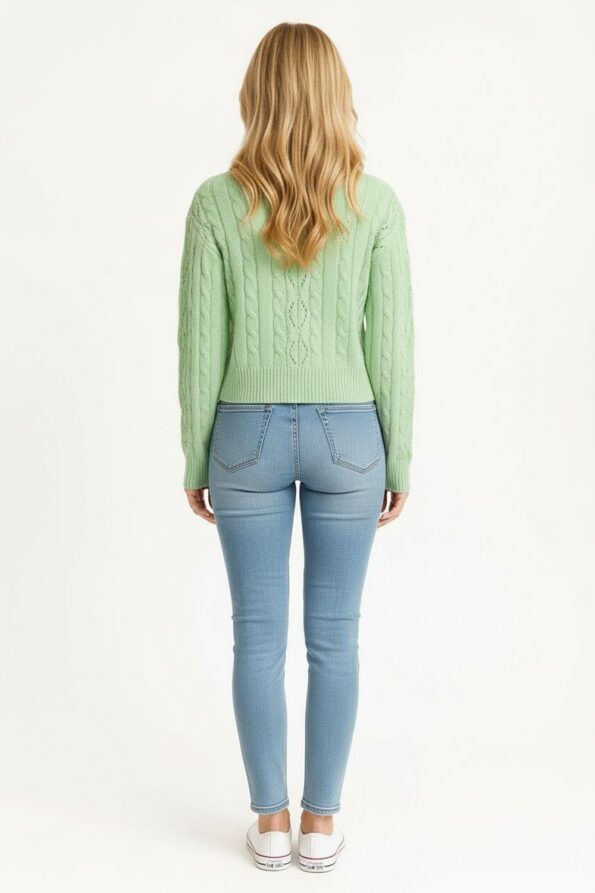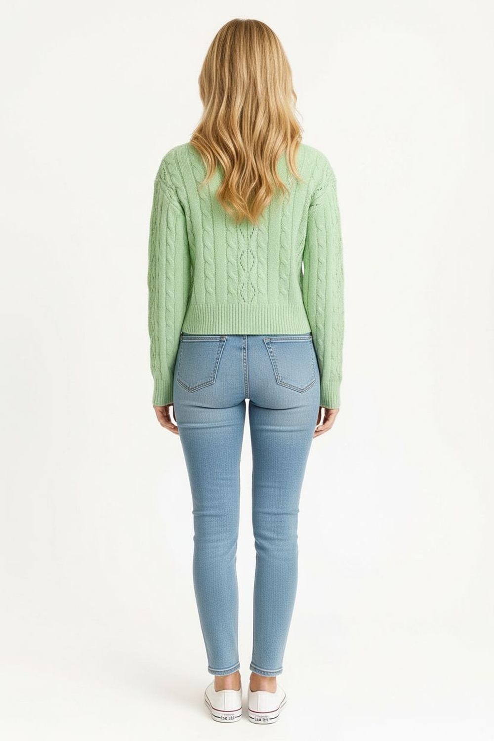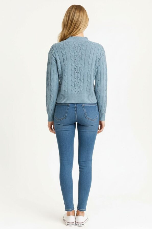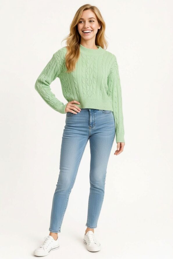 Suéter corto de punto con tejido calado y trenzado al frente que aporta textura y un toque delicado, cuello semi alto acanalado que ofrece estructura y estilo, puños y basta elásticos que aseguran un ajuste cómodo, confección en tejido suave y ligero ideal para las temporadas de clima fresco, diseño moderno que complementa looks casuales con encanto