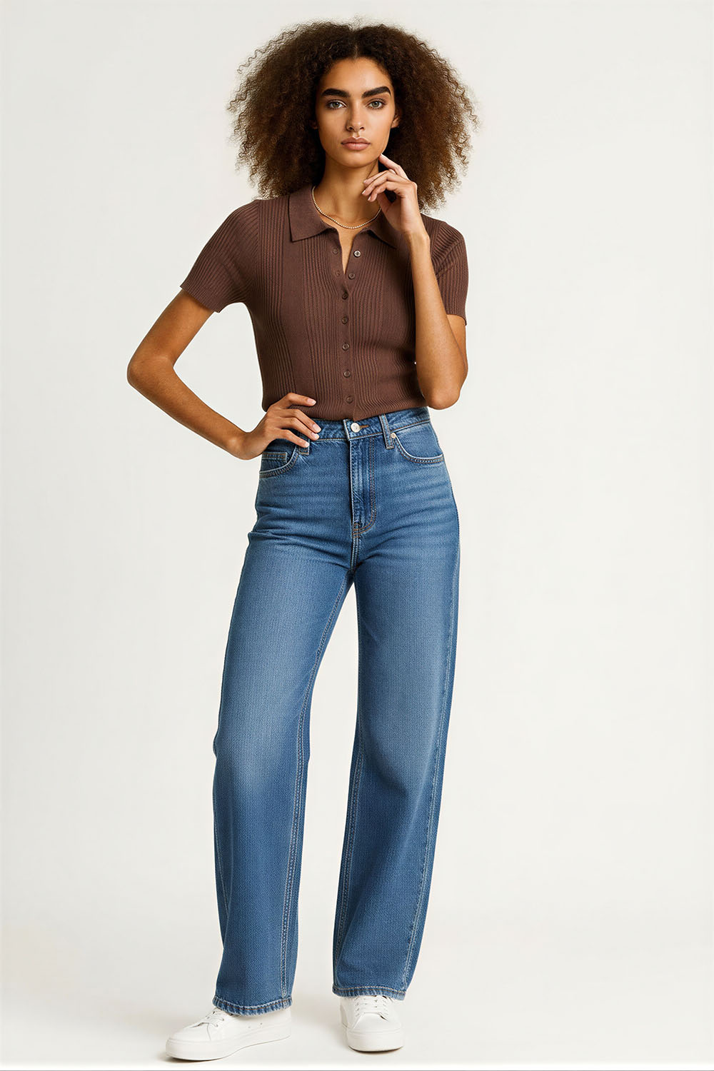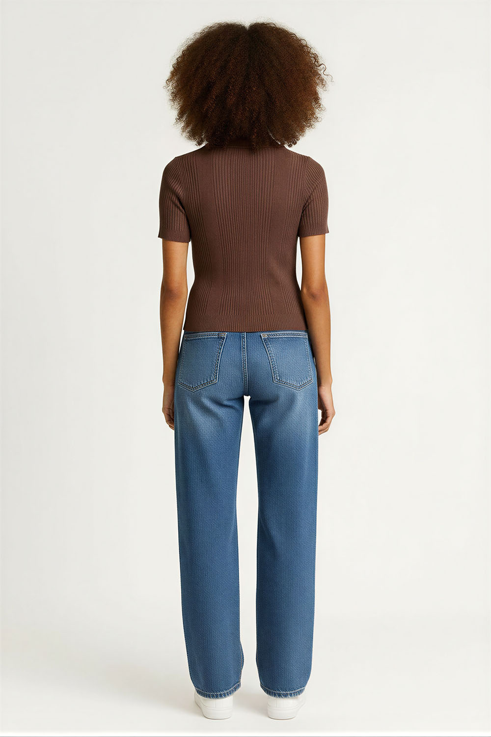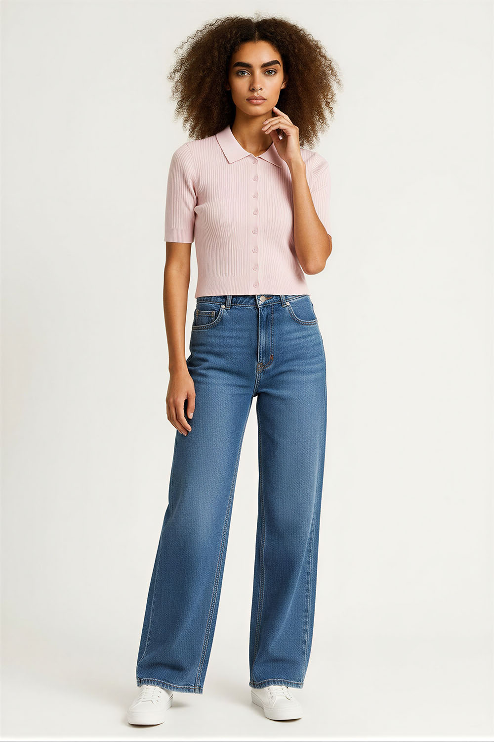 Suéter tejido de manga corta con cuello tipo camisero que aporta estructura, cierre frontal con botones que facilita el ajuste, diseño entallado que resalta la silueta, terminación inferior con borde ondulado que agrega detalle, confección en tejido acanalado que brinda elasticidad y comodidad