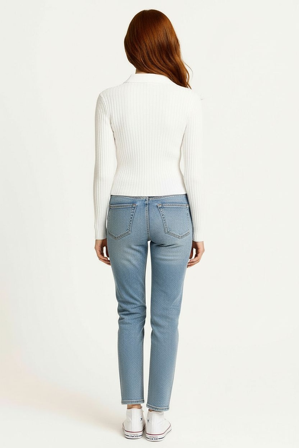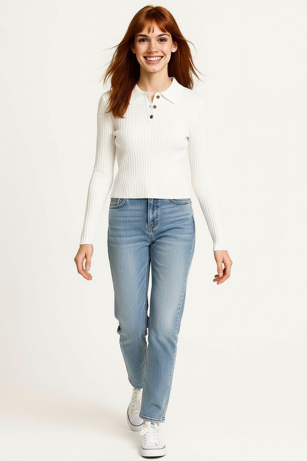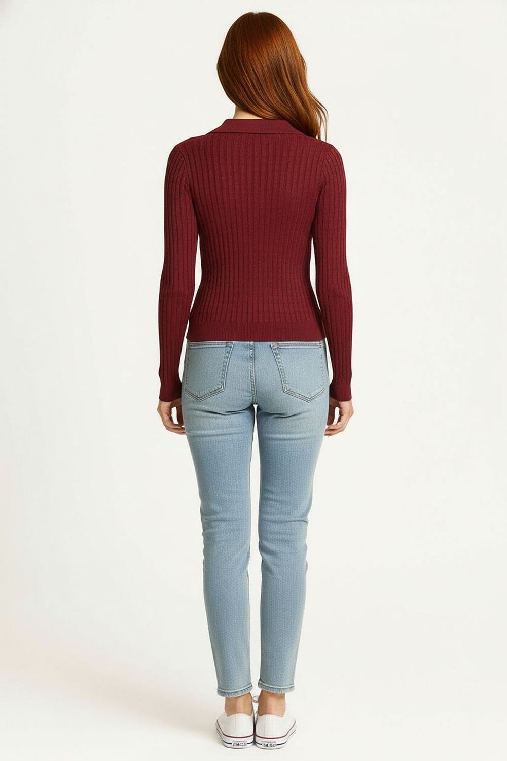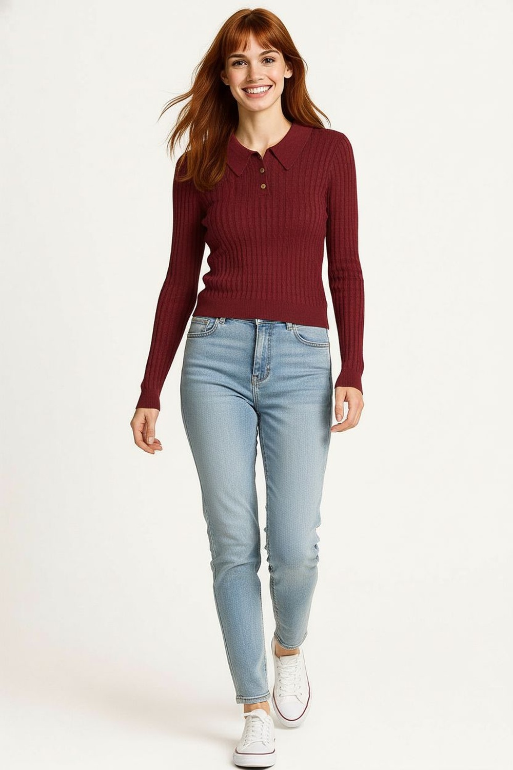 Suéter tejido de manga larga con diseño acanalado que aporta estructura y comodidad, cuello tipo polo con botones decorativos que realzan el estilo casual elegante, confección en tejido elástico de tacto suave que mantiene su forma con el uso