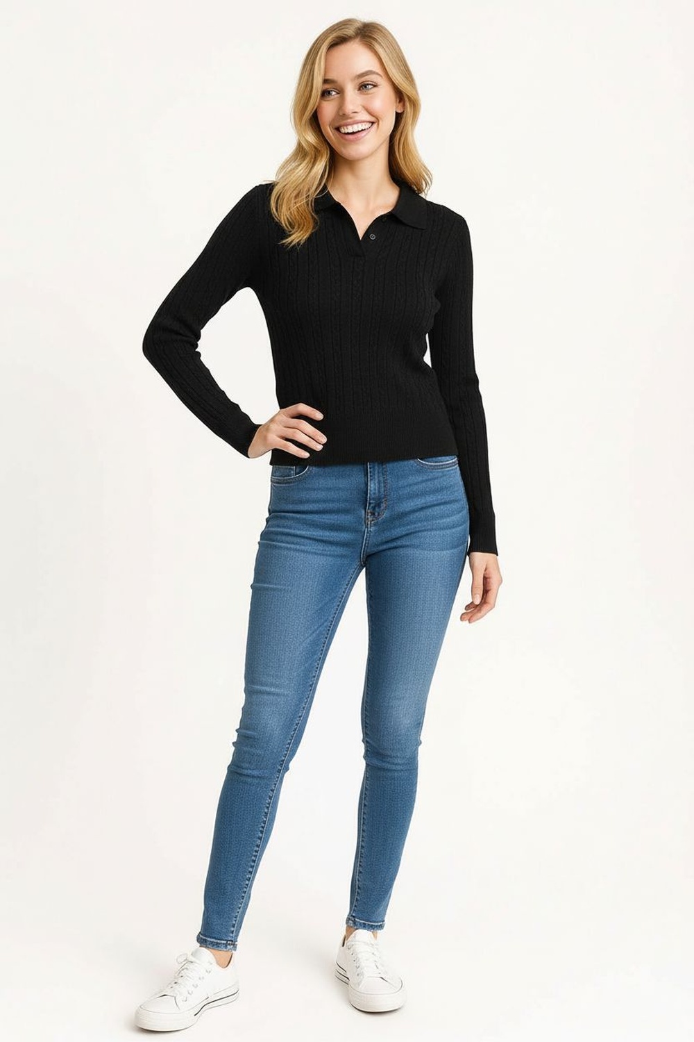 Suéter de manga larga con cuello tipo sport que aporta un toque moderno, confeccionado en tejido de punto con diseño trenzado que añade textura y estilo, pretina y puños acanalados que aseguran un ajuste cómodo, corte ajustado que realza la figura