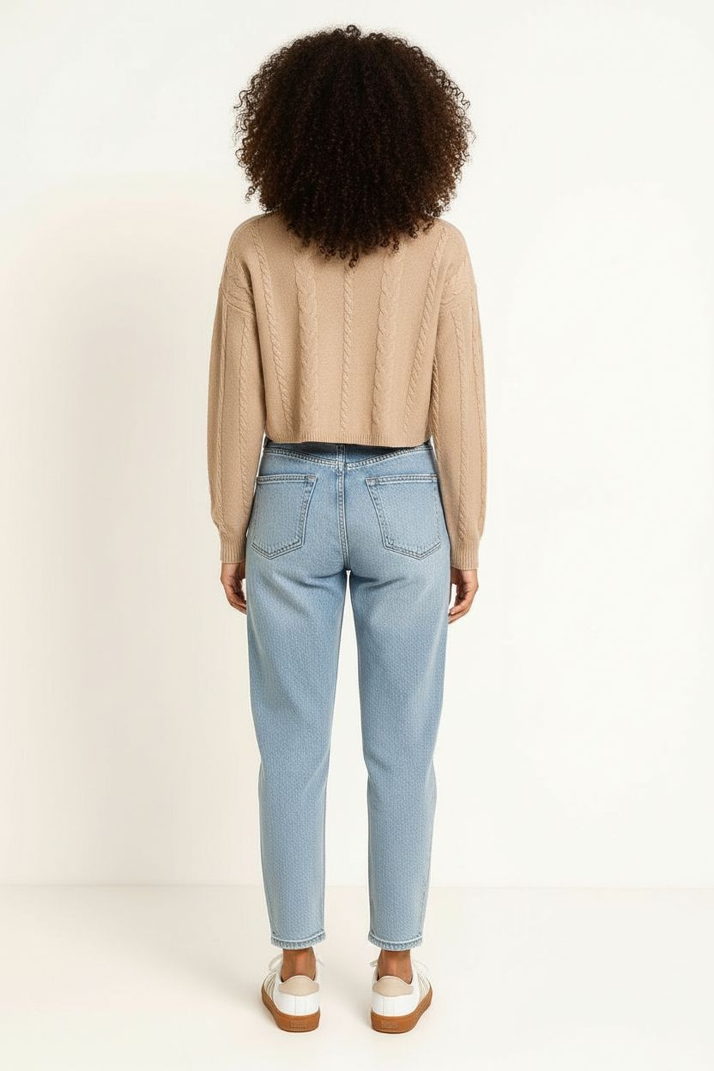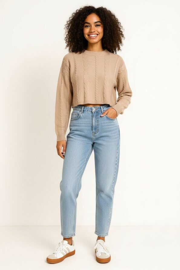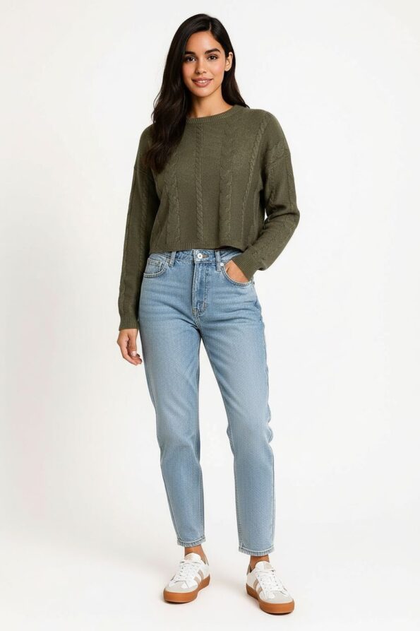 Suéter tejido con diseño de trenzas que aporta textura y estilo clásico, cuello alto que brinda abrigo y un toque sofisticado, manga larga con ajuste cómodo que favorece la movilidad, confección en punto elástico que se adapta suavemente al cuerpo ofreciendo confort y elegancia