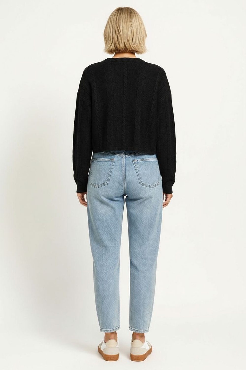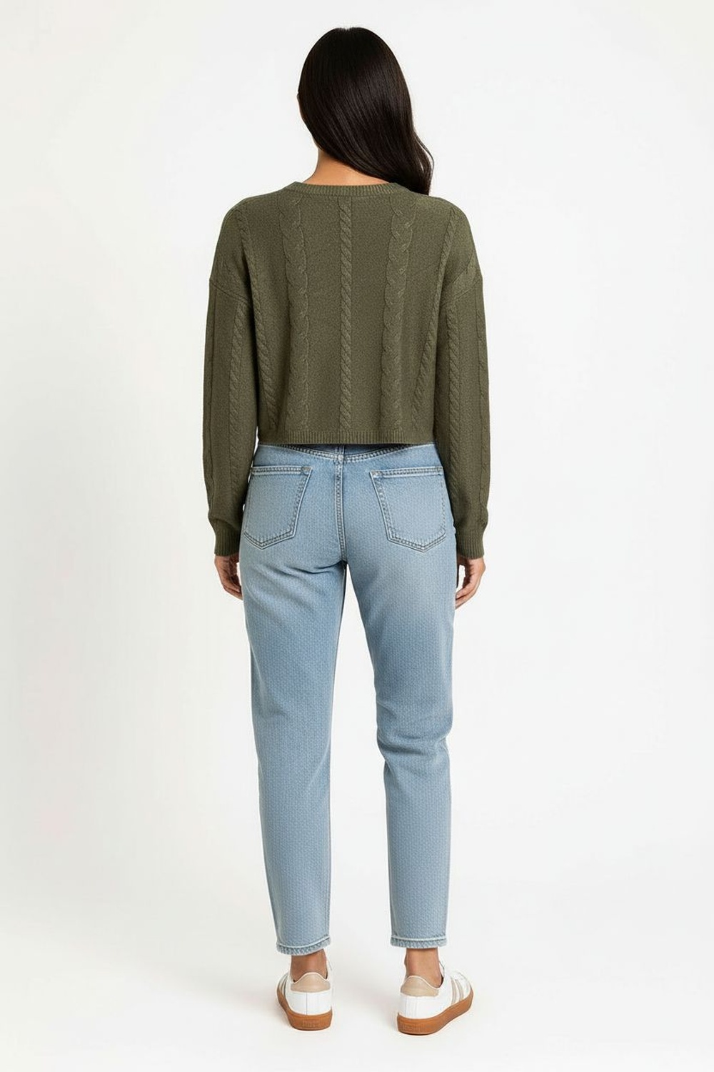 Suéter corto tejido en punto acanalado que ofrece textura moderna y ajuste favorecedor, diseño con manga raglán que aporta mayor comodidad y libertad de movimiento, cuello redondo clásico que realza el acabado versátil de la prenda, dobladillo recto en cintura que mantiene la estructura definida, confección en tejido elástico que asegura confort y durabilidad en cada uso