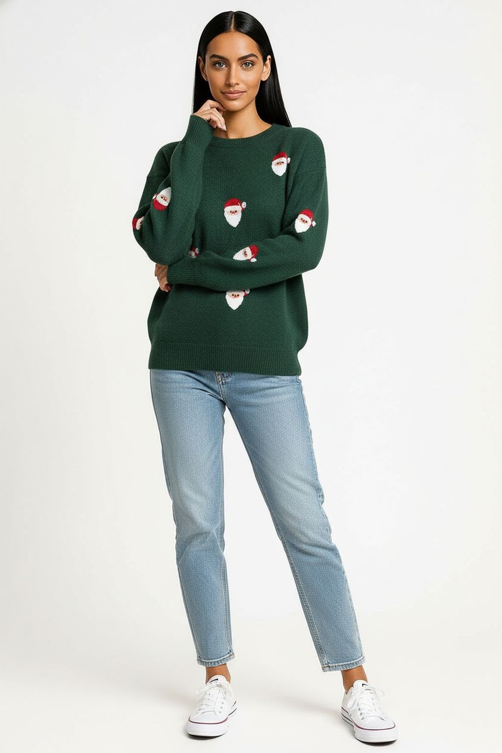 Suéter de tejido suave con aplicación frontal en relieve, cuello redondo y puños acanalados que aseguran ajuste cómodo, diseño divertido con textura cálida perfecta para temporada invernal, estructura ligera que mantiene confort y durabilidad