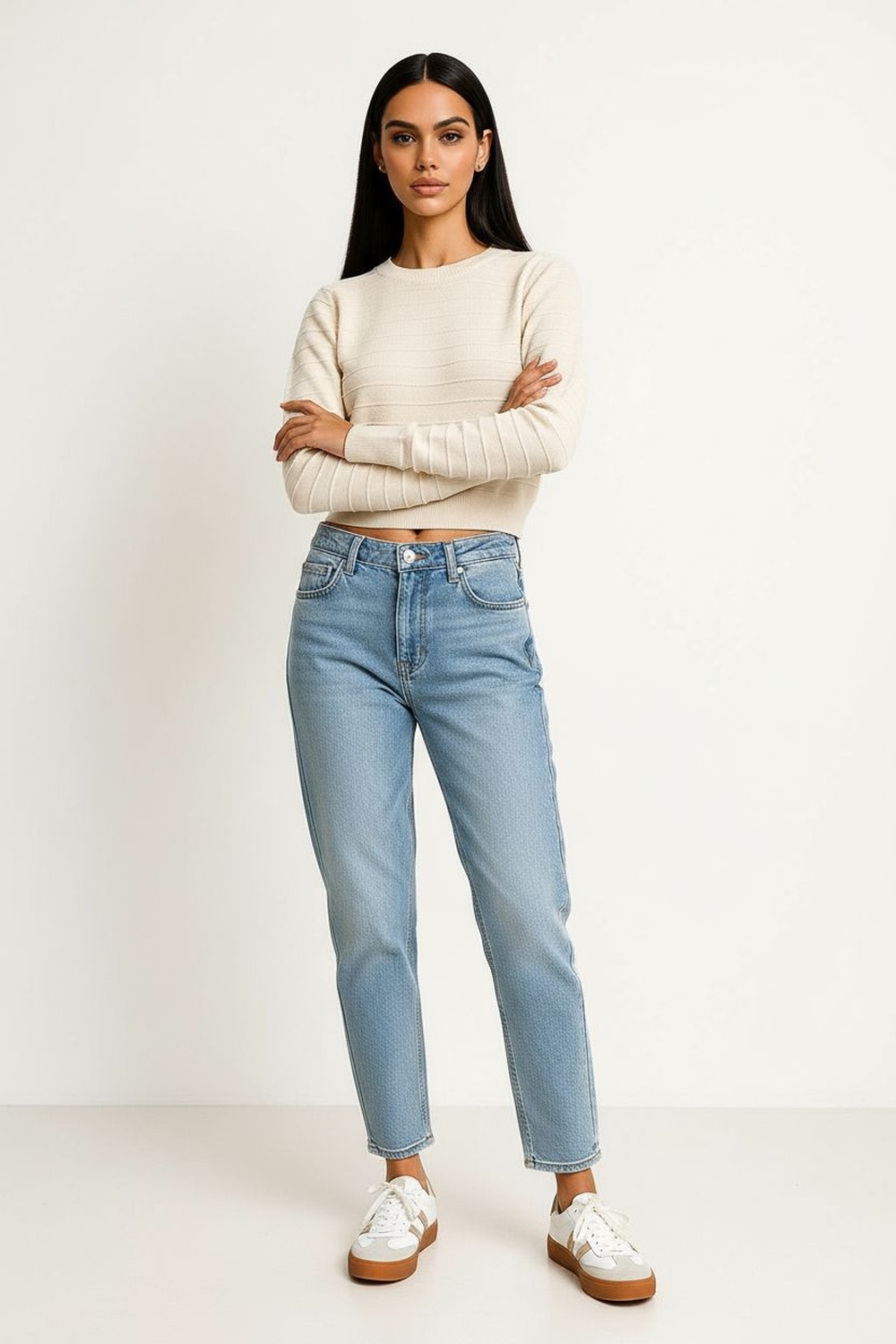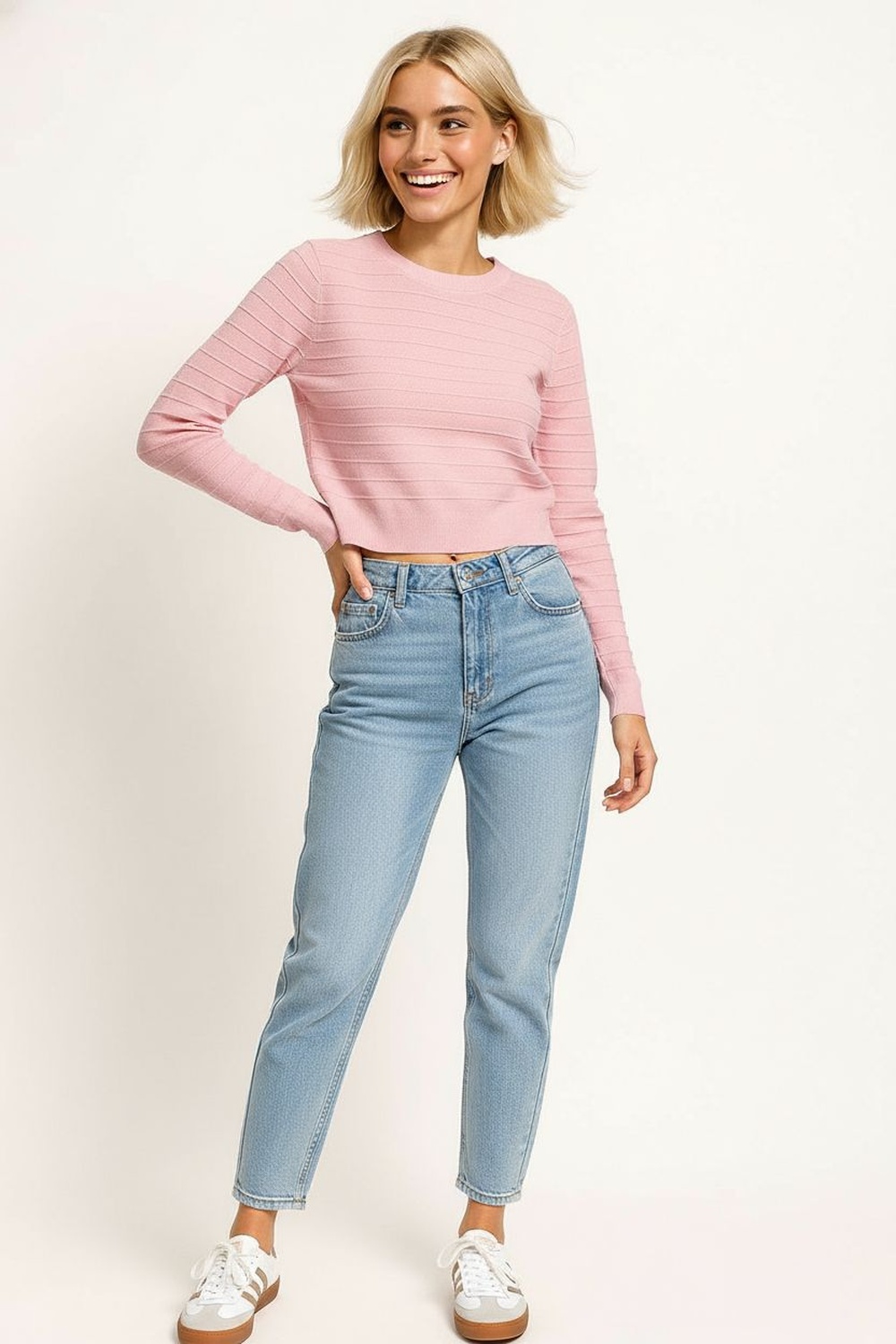 Suéter de cuerpo amplio con diseño tejido a rayas, cuello redondo y manga larga ajustada que aporta equilibrio visual, textura acanalada que ofrece un acabado moderno y cómodo, elaborado con materiales ligeros que permiten movilidad sin perder forma