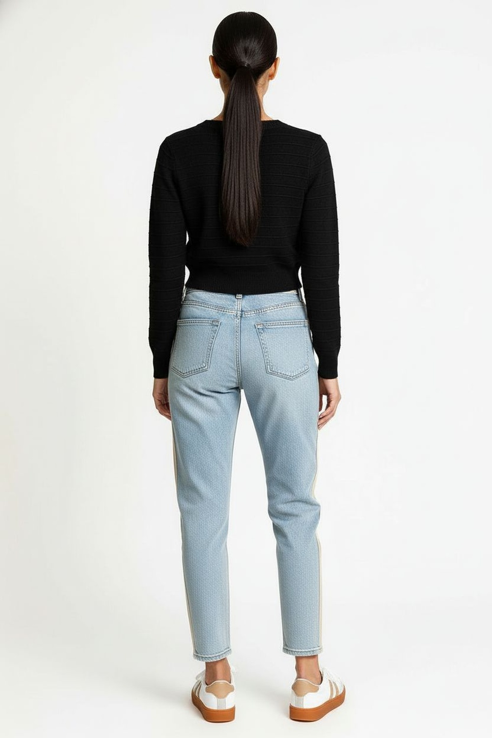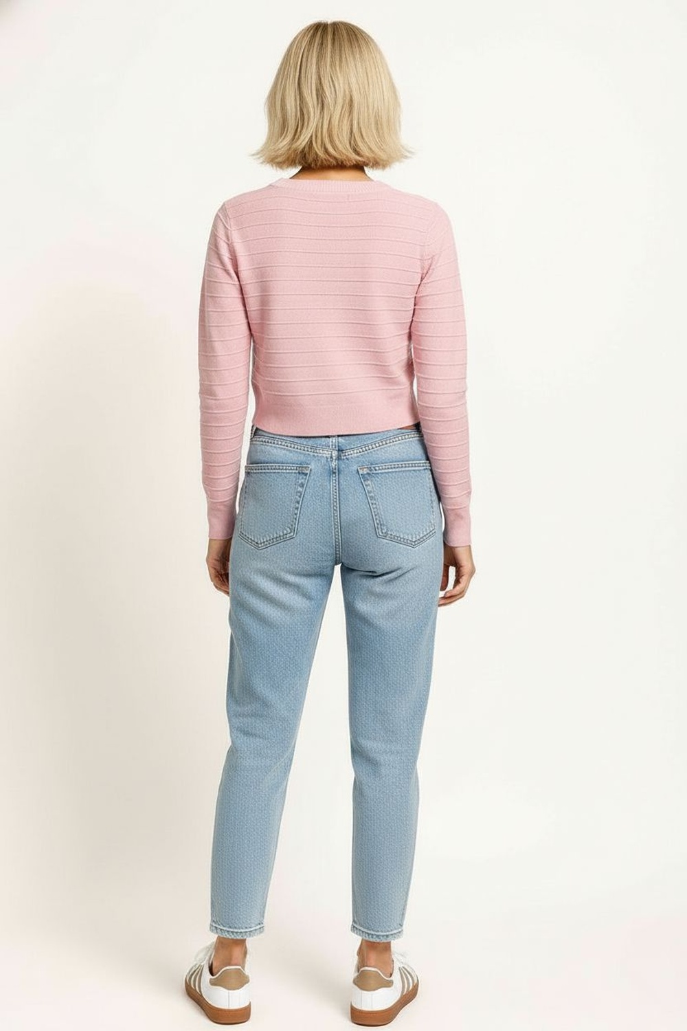 Suéter de manga larga confeccionado en tejido fino con textura acanalada, cuello tipo camisero con contraste que resalta el diseño, botonadura frontal que permite ajuste cómodo y personalizado, silueta corta con estructura ligera que aporta comodidad y estilo casual