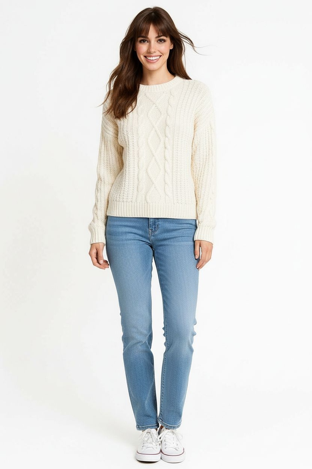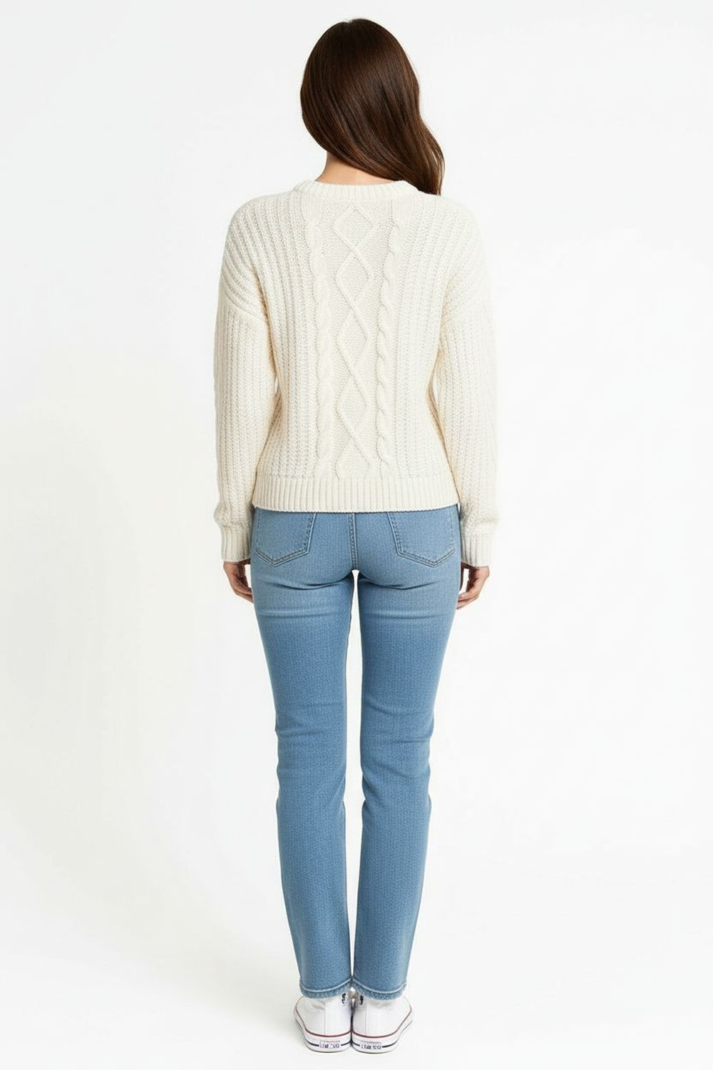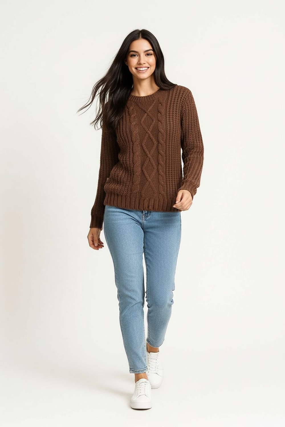Sueter tejido con diseño de rombos al frente, textura gruesa que brinda abrigo, cuello redondo y pretina ancha que aportan estructura y soporte al ajuste natural del cuerpo