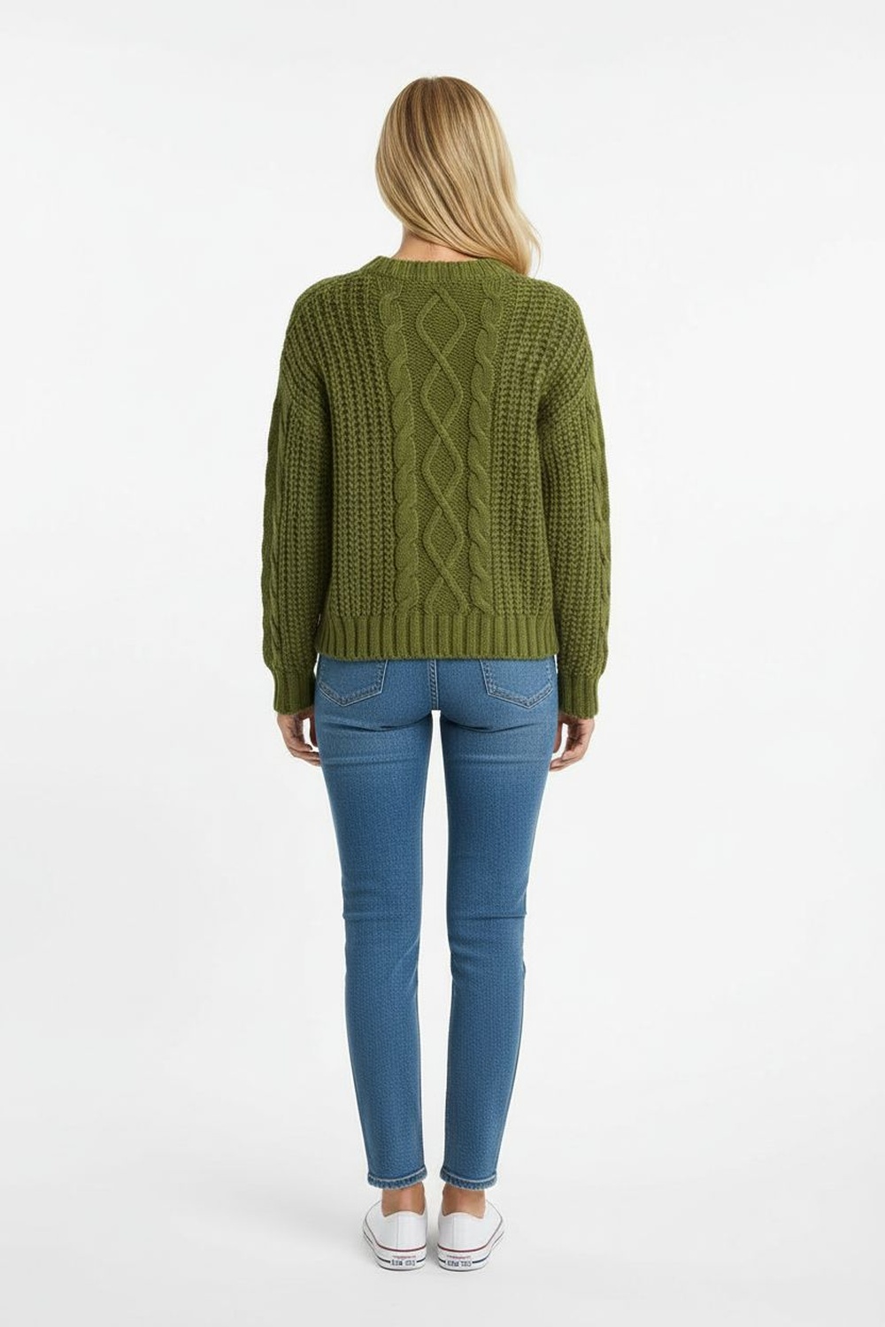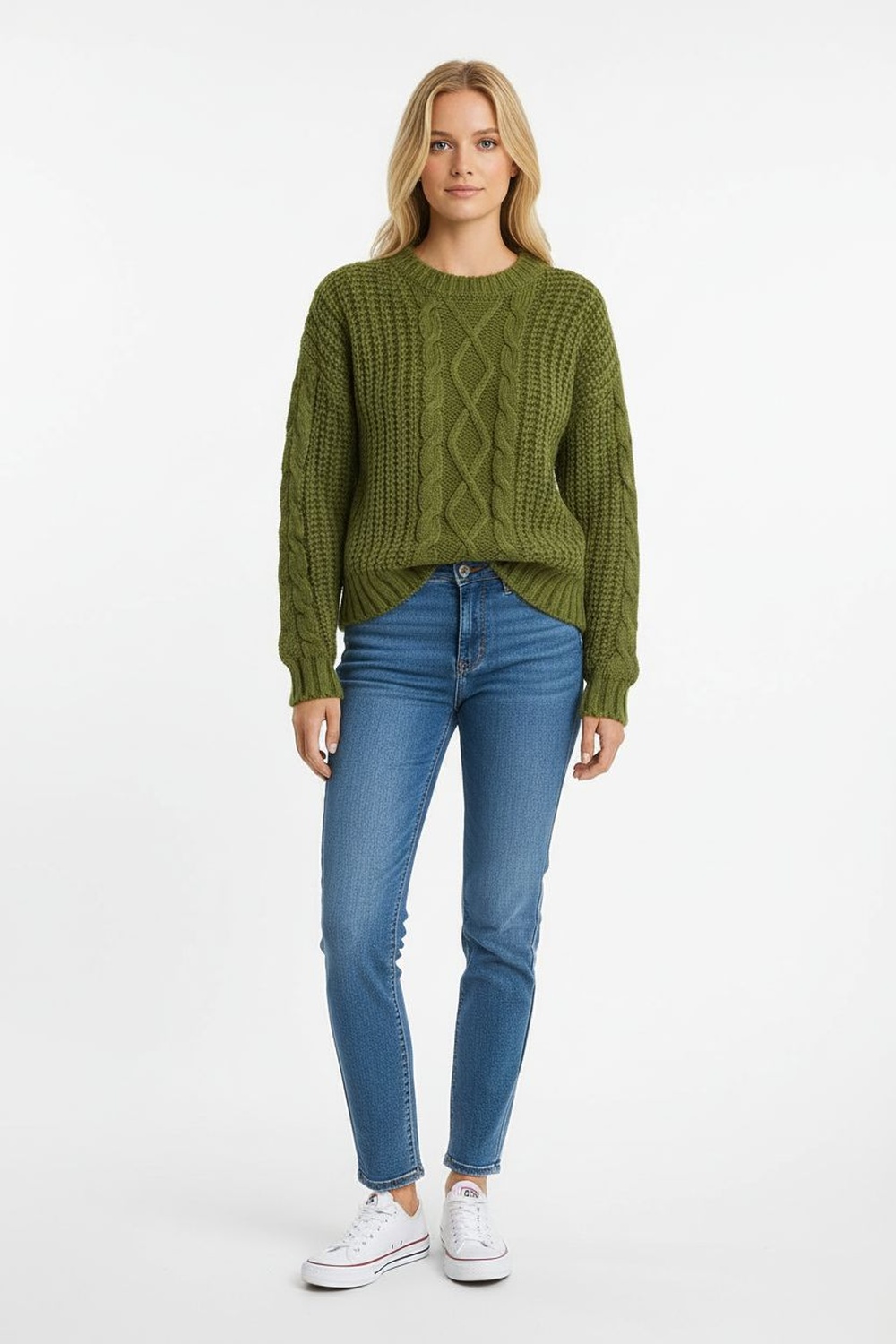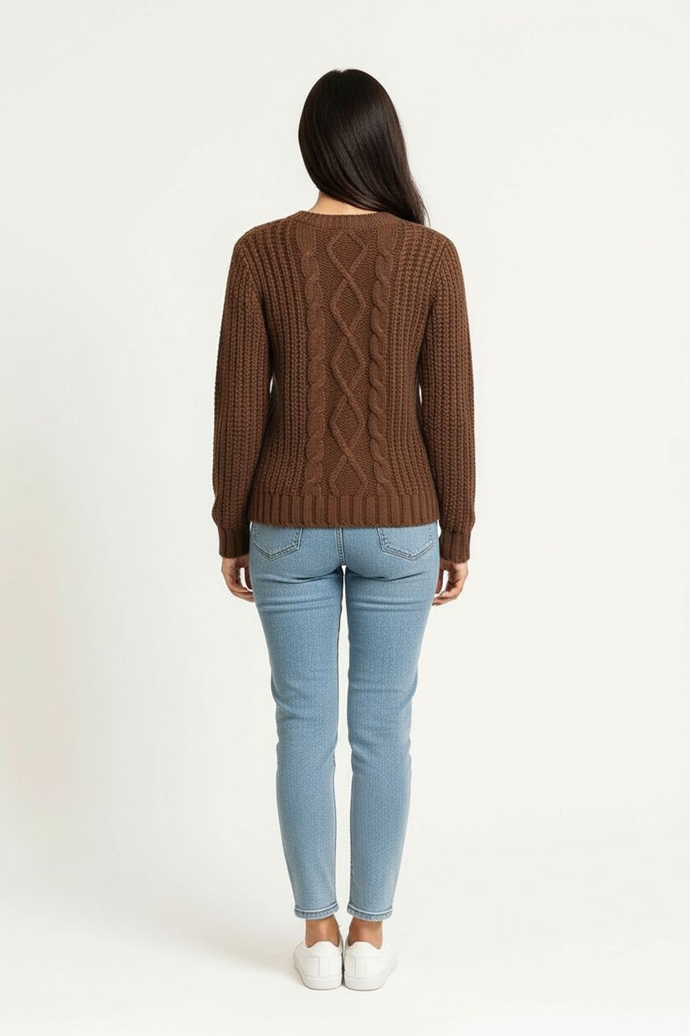 Sueter tejido con diseño de rombos al frente, textura gruesa que brinda abrigo, cuello redondo y pretina ancha que aportan estructura y soporte al ajuste natural del cuerpo