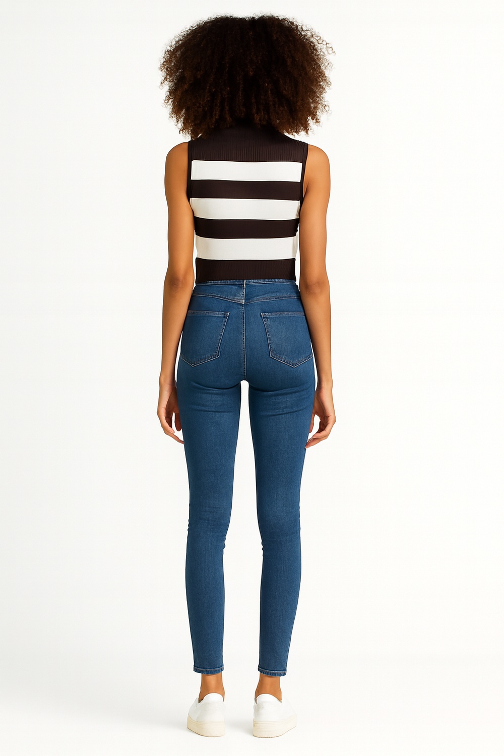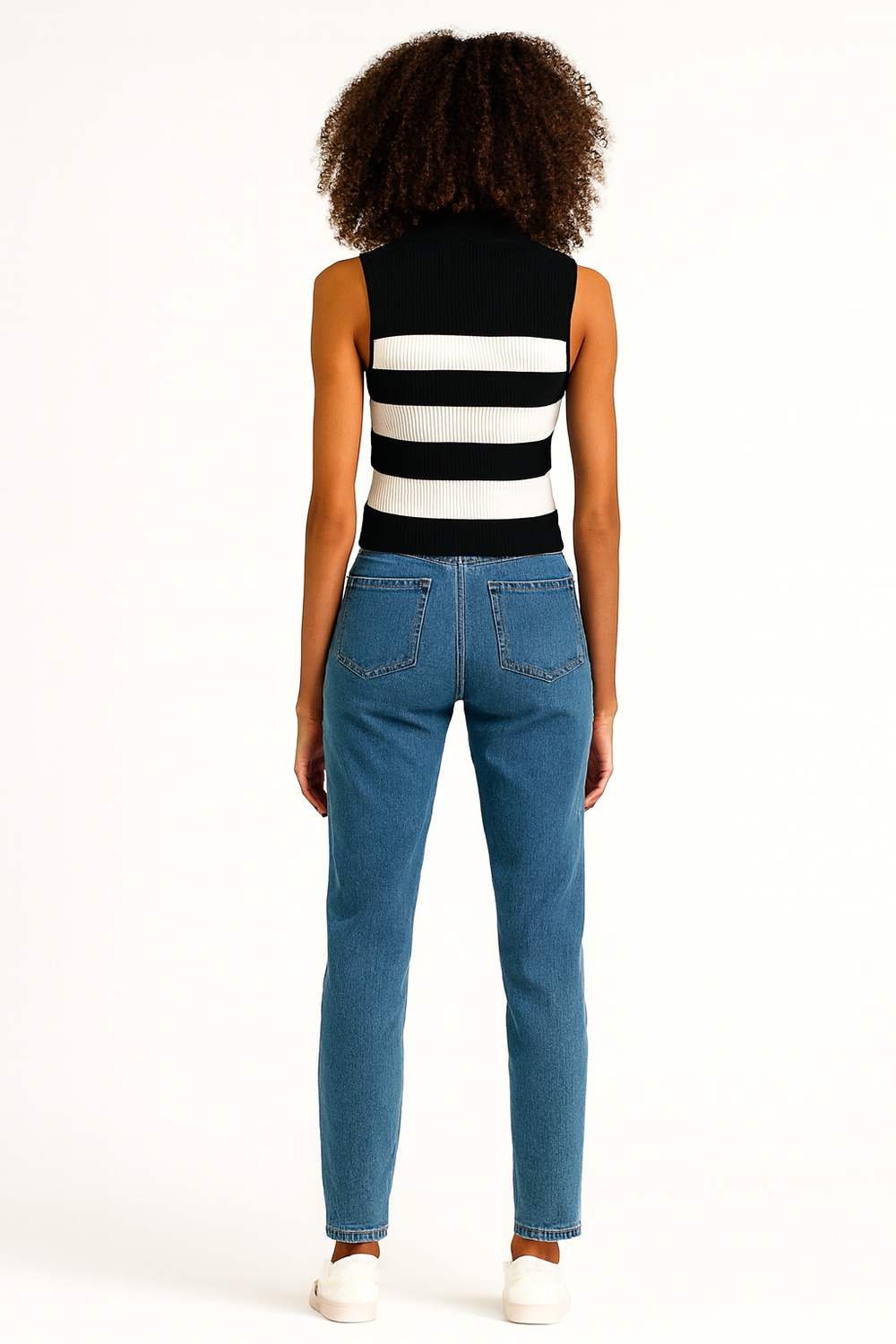 Top tejido de corte corto con cuello alto que enmarca el rostro, diseño acanalado que aporta firmeza al ajuste, franja ancha decorativa integrada al tejido, confección compacta que define la silueta, largo a la cintura que proporciona un acabado equilibrado