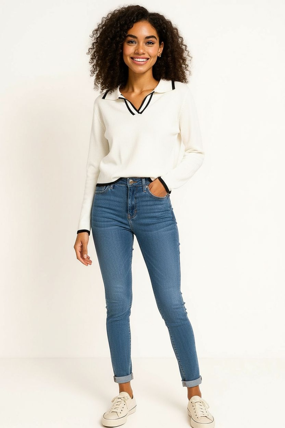 Suéter de manga larga confeccionado en tejido de viscosa suave que aporta confort y ligereza, cuello tipo polo con escote en V ribeteado que realza el diseño, corte recto que favorece la silueta y permite libertad de movimiento, terminados limpios que brindan un acabado moderno y versátil