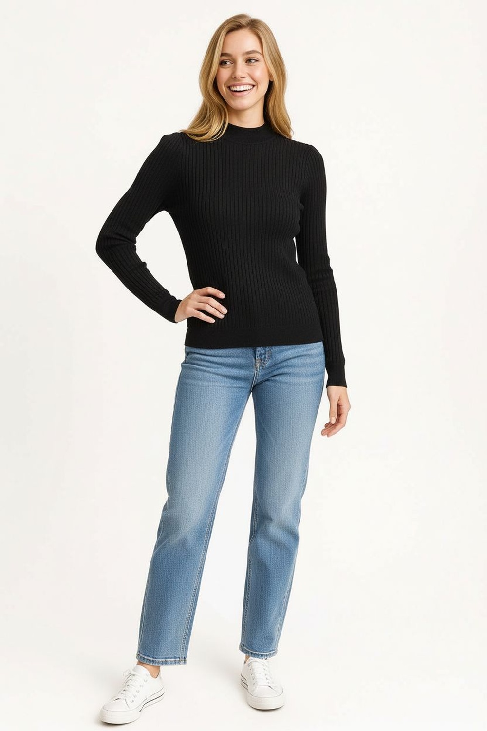 Suéter de manga larga confeccionado en viscosa que ofrece suavidad y elasticidad, cuello alto que aporta calidez y un estilo moderno, pretina ajustada que define la silueta y asegura mejor fit, tejido acanalado que brinda comodidad y ligereza, ideal para outfits casuales o combinaciones elegantes de temporada