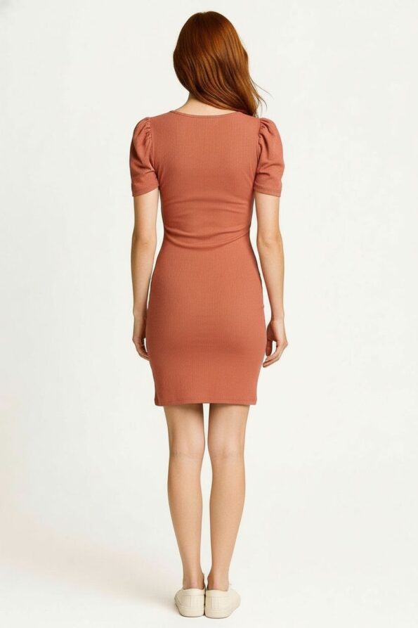 Vestido de tejido rib con corte ajustado que realza la silueta, manga corta con pliegues que aportan volumen y detalle femenino, escote redondo con terminación limpia que brinda comodidad y acabado moderno, confección en material elástico que favorece el movimiento y ofrece un ajuste favorecedor para distintas ocasiones