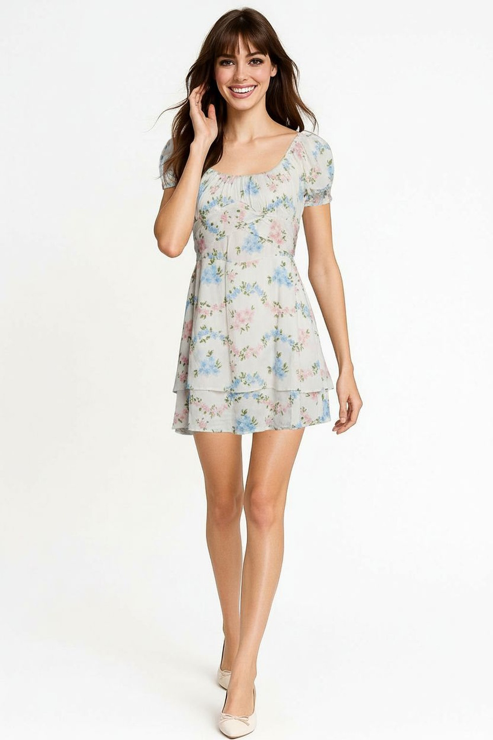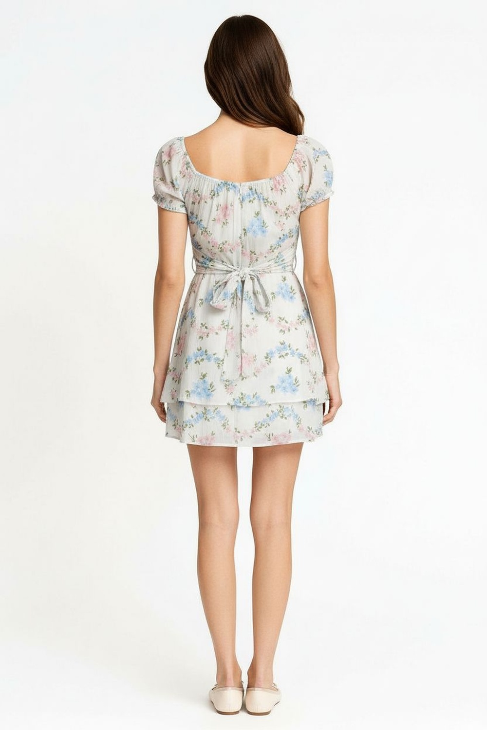 Vestido corto con escote amplio y manga corta con volumen ligero que aporta comodidad, corte a la cintura con amarre posterior que permite ajuste personalizado, falda con caída suave que brinda movimiento, confección en tejido ligero con textura delicada y sensación fresca