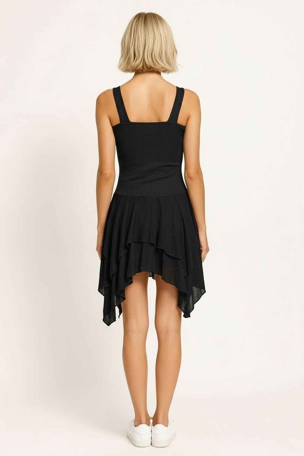 Vestido de silueta ajustada en la parte superior con caída fluida en el bajo, confección en tejido con relieve que aporta dimensión y movimiento, escote recto con tirantes delgados que brindan soporte ligero, largo corto con terminación irregular que genera dinamismo visual, estructura suave que se adapta al cuerpo manteniendo comodidad durante su uso