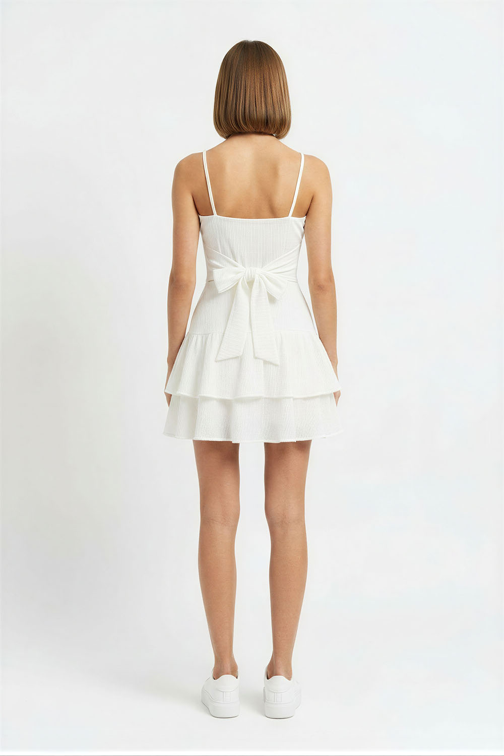 Vestido corto con tirantes delgados que brindan soporte ligero, diseño con amarre en espalda que permite ajuste personalizado, corte con doble capa en falda que aporta movimiento, confección ligera con caída fluida que favorece la silueta y brinda comodidad