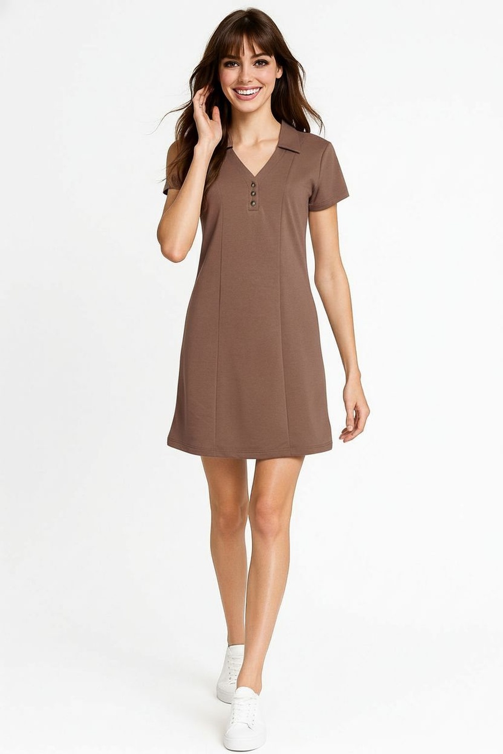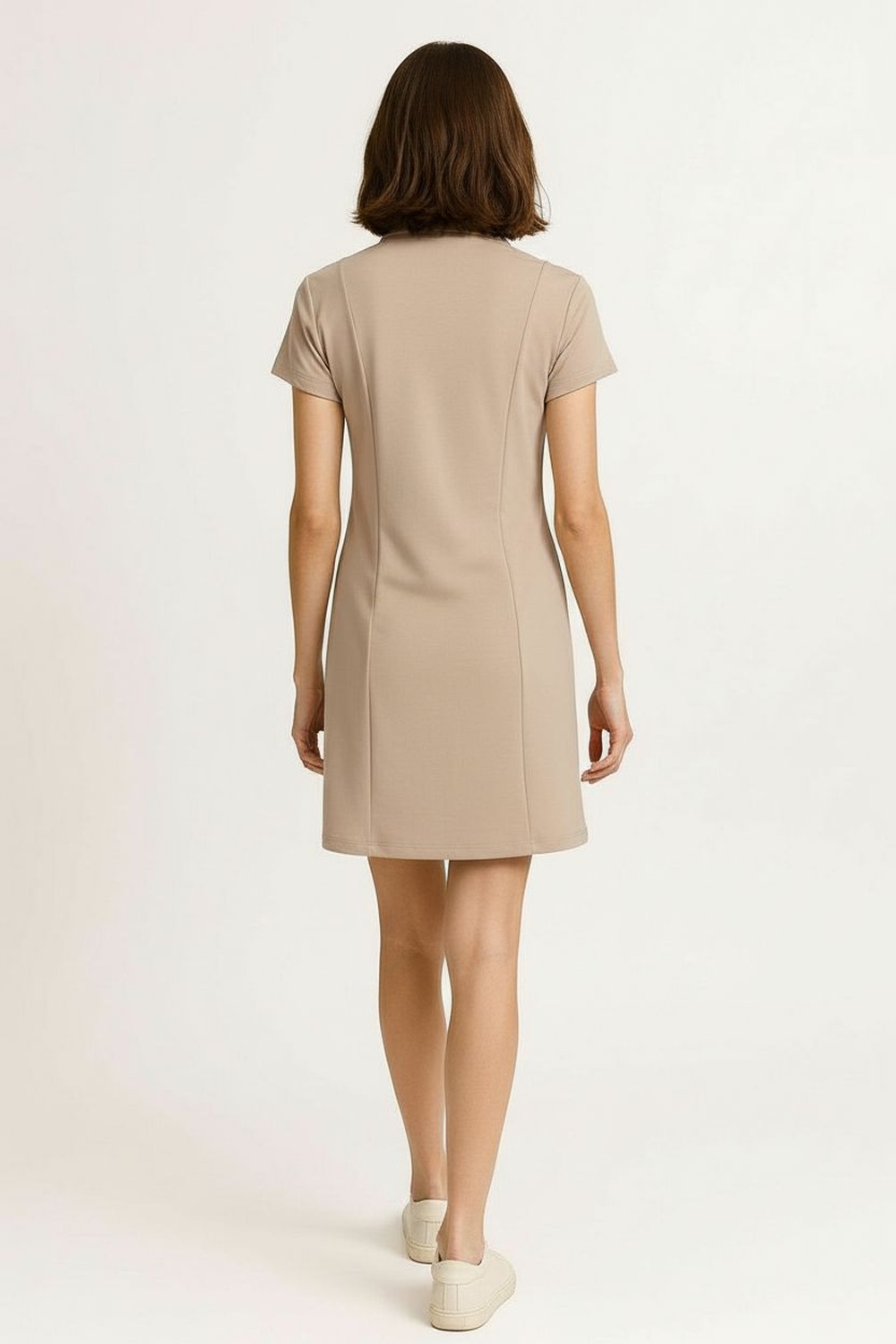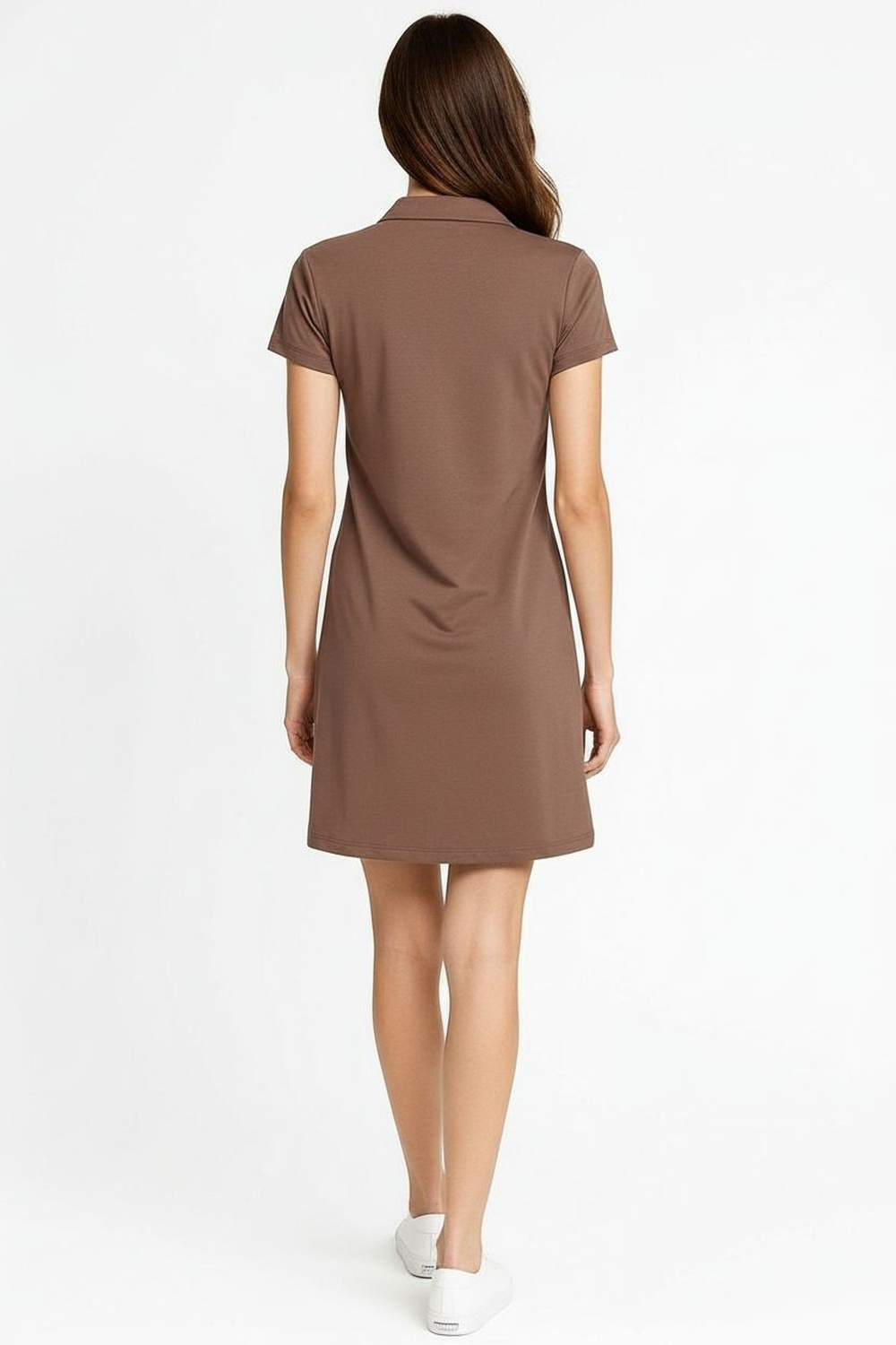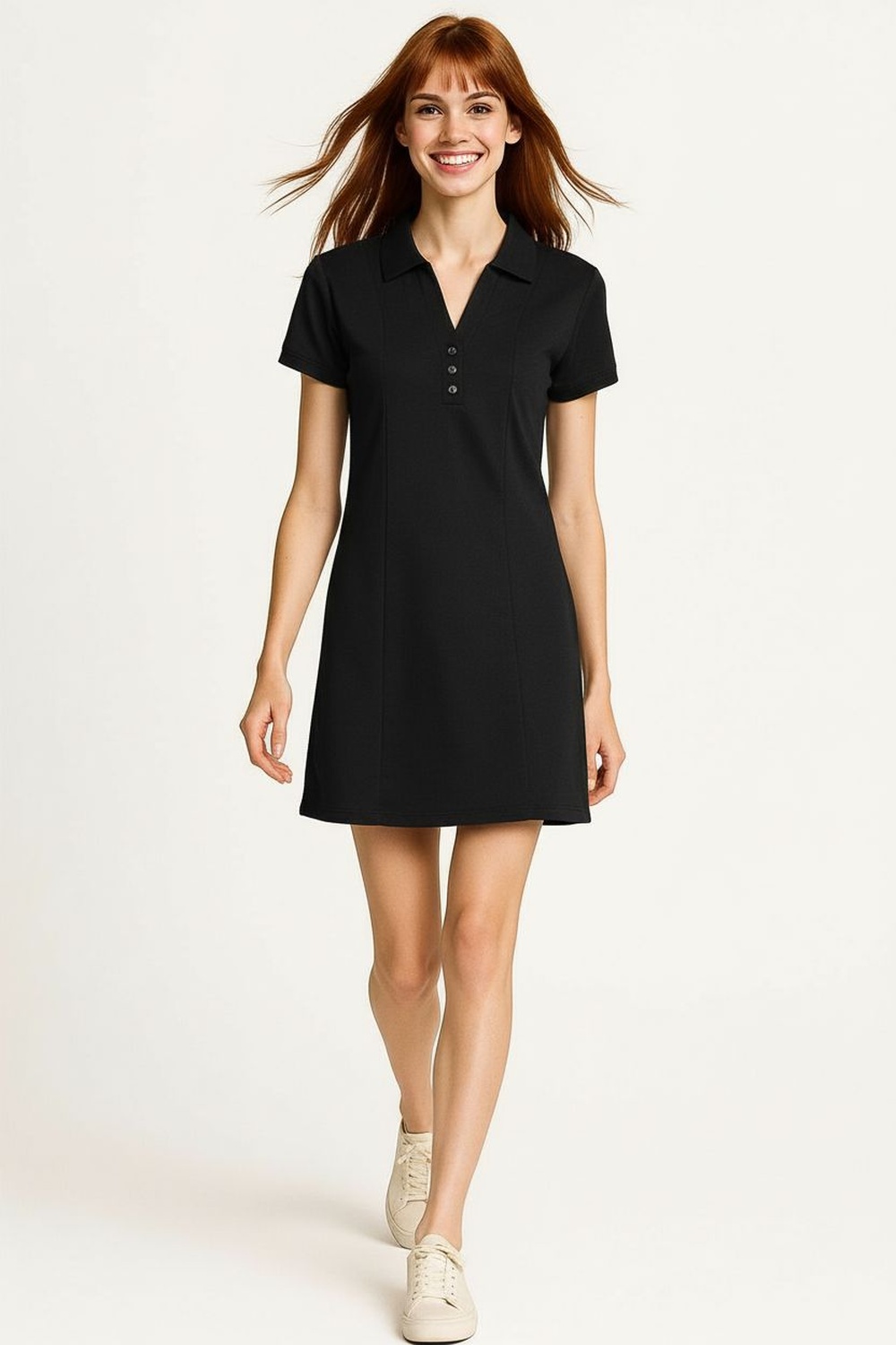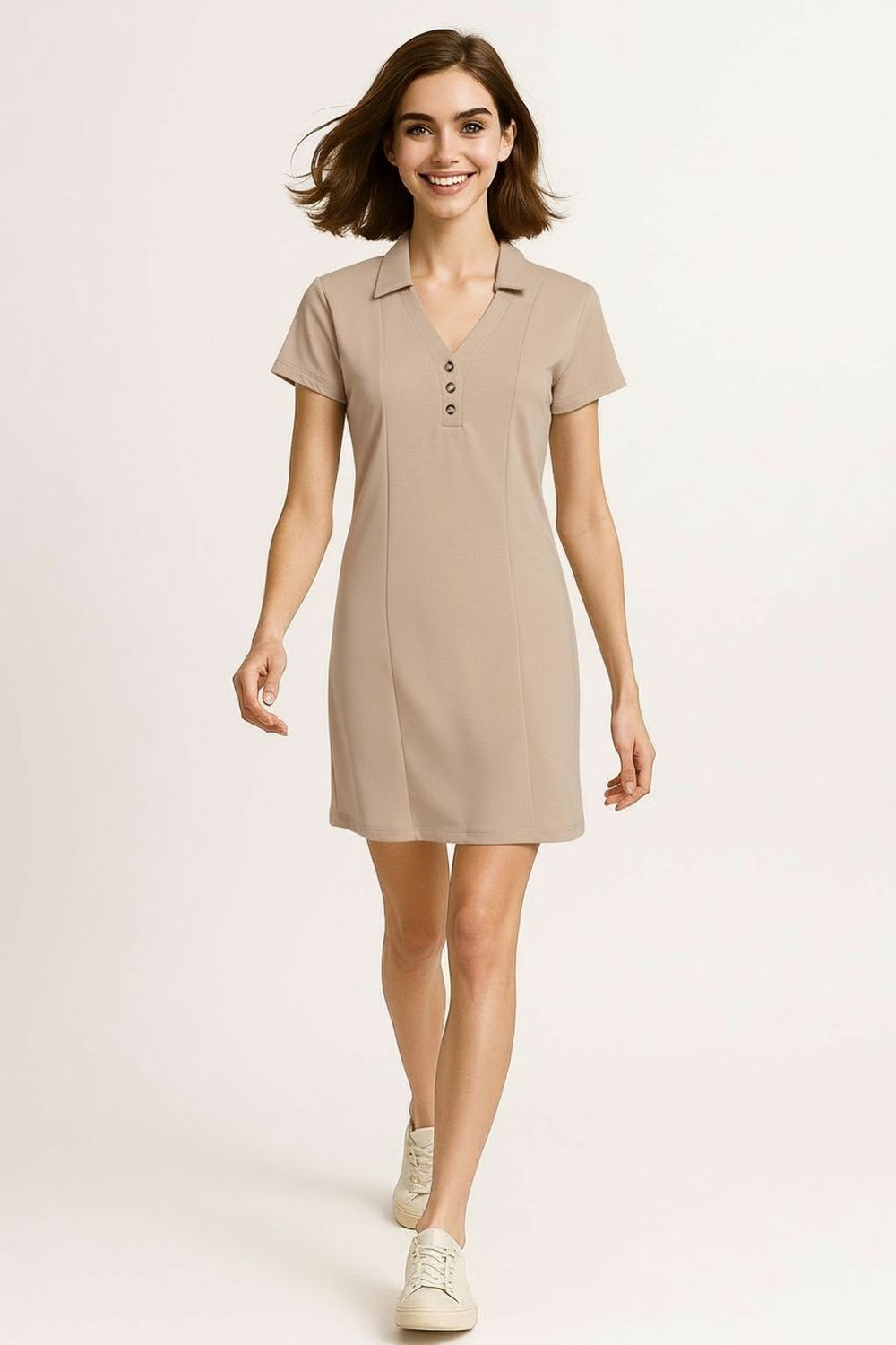 Vestido corto tipo polo con cuello camisero, botonadura frontal decorativa, pinzas de ajuste que definen la figura, bolsillos laterales tipo parche que aportan funcionalidad, confección en tejido suave y resistente con caída natural