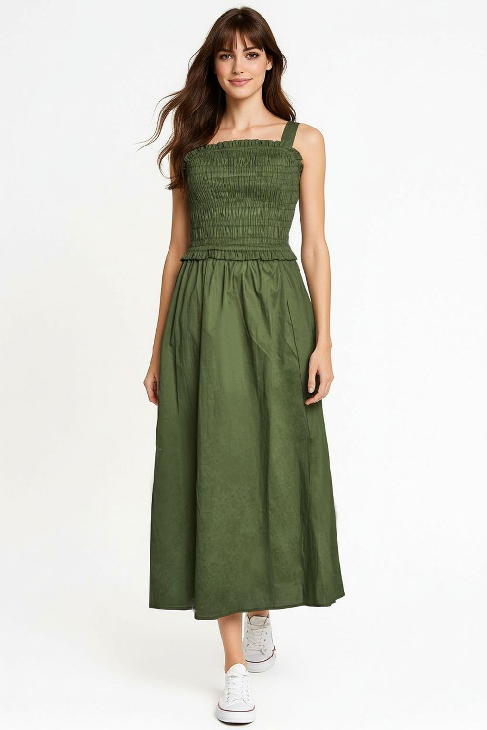 Vestido de tirantes anchos con panel superior enresortado que se ajusta al contorno y brinda soporte cómodo, escote recto que estiliza la parte superior, falda de largo midi con cortes horizontales que aportan amplitud y caída ligera, confección en tela suave de tacto agradable que permite frescura durante el día, estructura fluida que realza movimiento natural