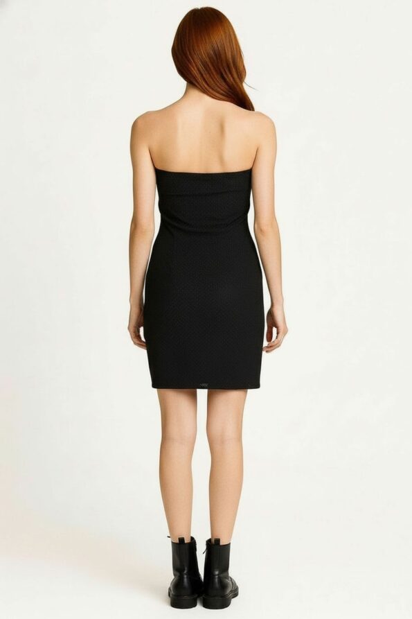 Vestido corto con diseño strapless que resalta los hombros, confeccionado en tejido de mesh con apliques de lentejuelas que aportan brillo y sofisticación, ajuste ceñido al cuerpo que realza la figura, acabado interior suave que brinda comodidad durante su uso
